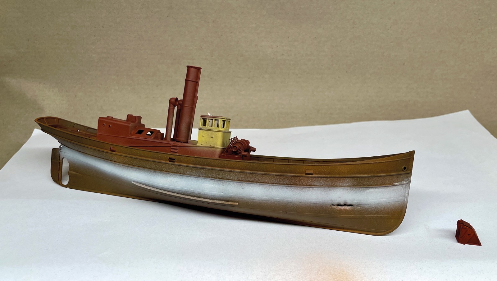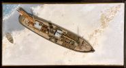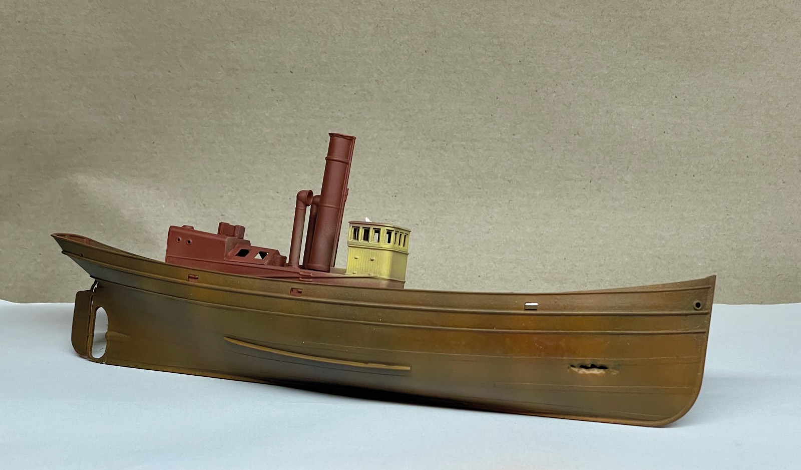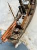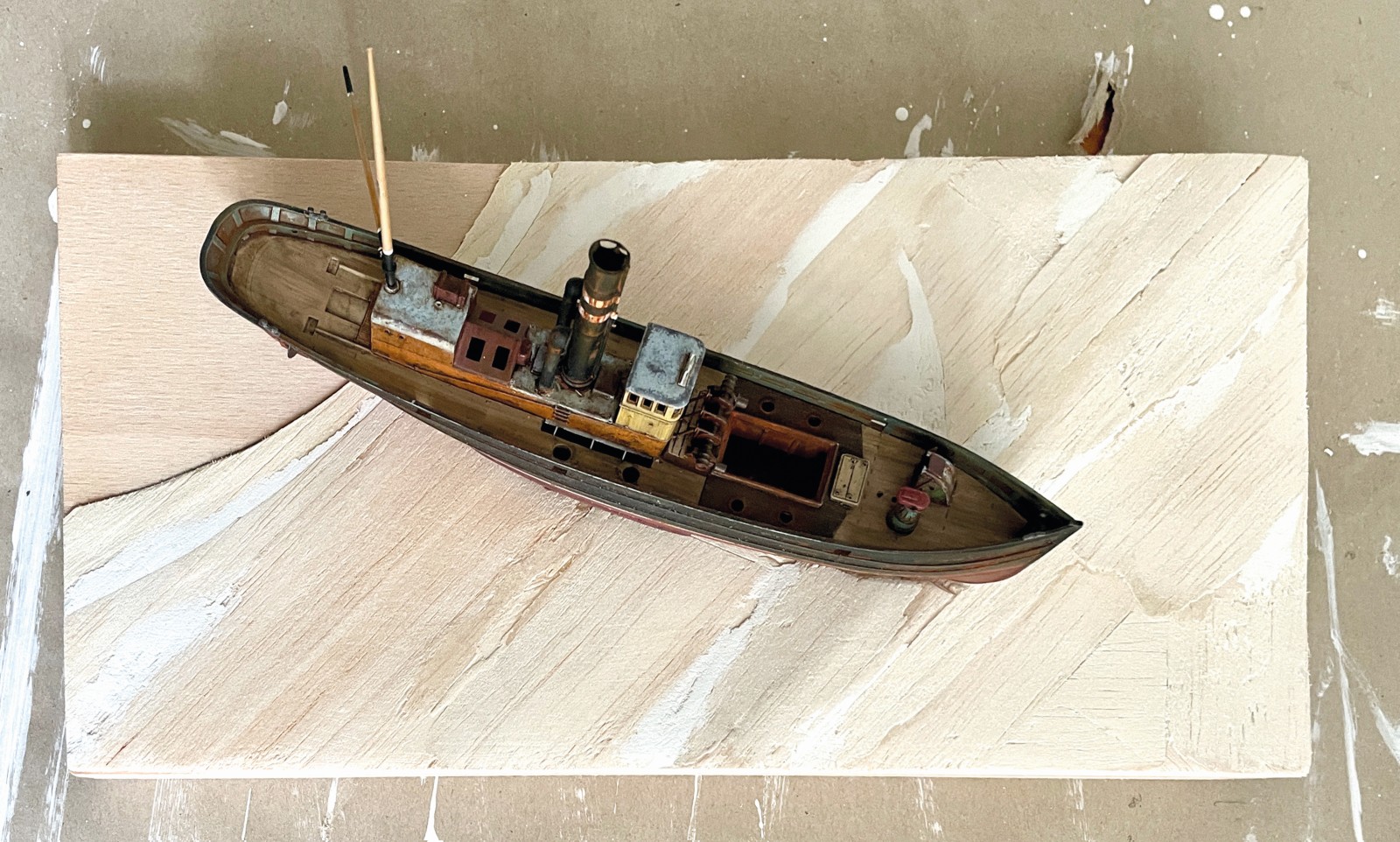 Nachdem der Rumpf ausgiebig mit diversen Lagen an Grundtönen den Chipping Fluids und letztendlich dem fertigen Anstrich versehen war, begann der Prozess des Verrosten und Verrottens. Nun habe ich ja durchaus ein bisserl Erfahrung mit dem Altern von Schiffen, verließen doch schon so manche meine kleine Werft. Das hier war jedoch eine gänzlich neue Herausforderung. Ein richtiges Wrack musste gehörig deftigere Spuren aufweisen, als ein noch in Gebrauch stehendes Schiff. Zu bedenken gilt es immer in welche Richtung das am Rumpf herablaufende Wasser nimmt, wo es länger stehen bleibt und somit Rost entsteht, wo Farbe abgeschabt wurde oder abgeplatzt ist oder wo sich schlichtweg flächiger Rost ansetzt und dann durch herablaufendes Regenwasser wieder abgespült wird.