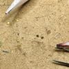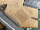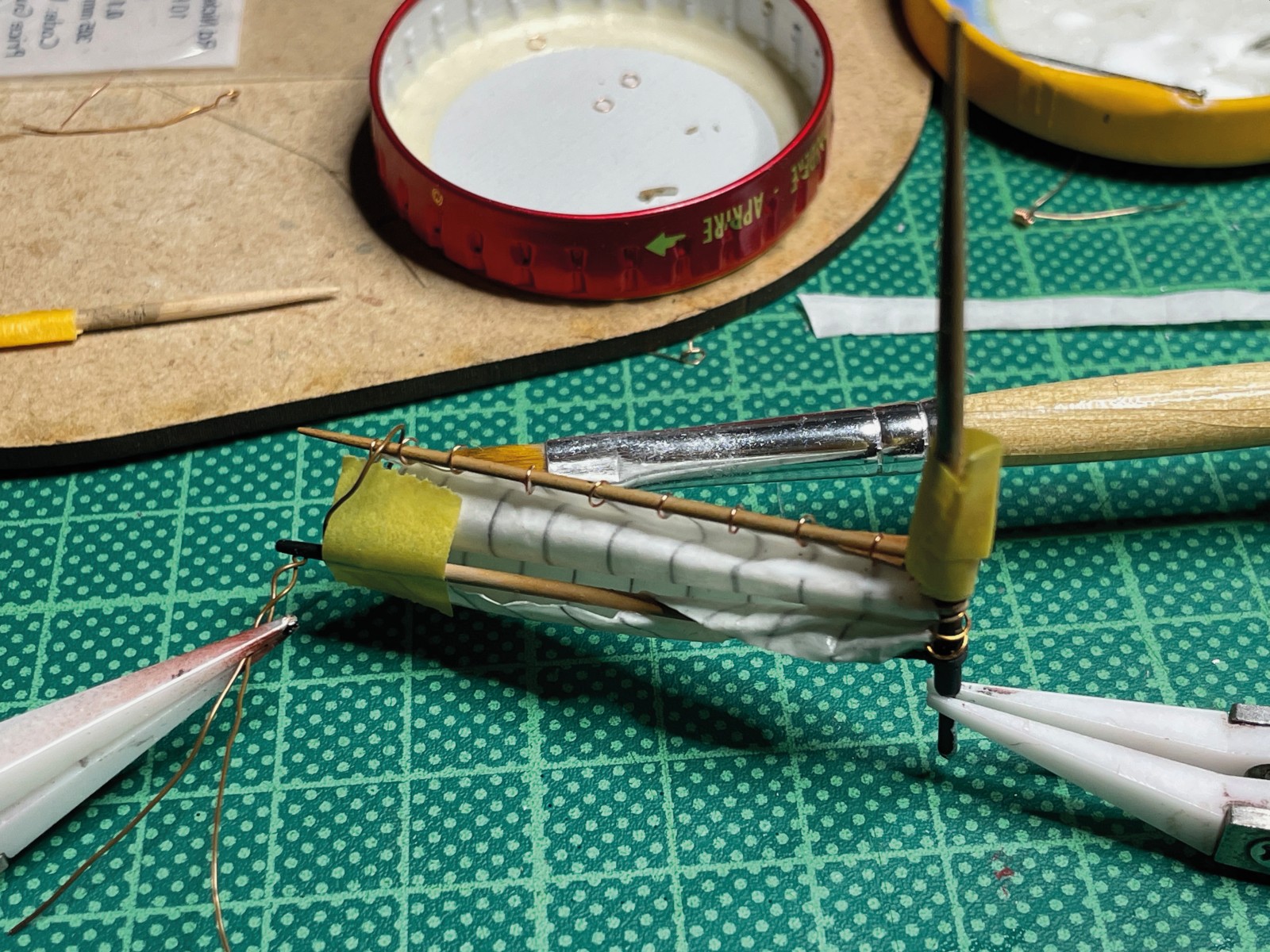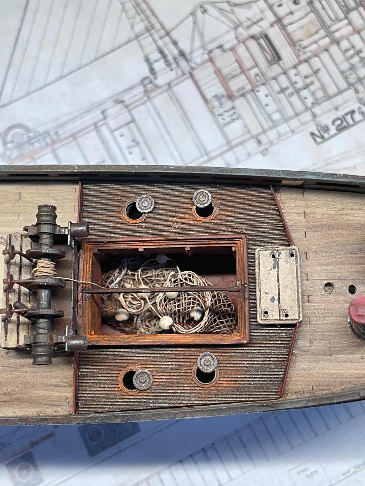 Die Abdeckung der Ladeluke wollte eingebrochen dargestellt werden, um Einblick in den mit Fischernetzen gefüllten Laderaum zu gewähren. Das hatte zur Folge das Netze hergestellt werden mussten, die eingebrochen Planken und nicht zuletzt die Persenning, die das Ganze einmal abgedeckt hat. Da gab es eine Vielzahl von diversen Stoffen darzustellen, wie bei den Segeln helfe ich mir hier mit vorher eingefärbtem und durch verdünnten Weißleim gefügig gemachtem Papier. Das funktioniert ganz hervorragend wenn das Papier dünn genug ist.