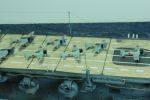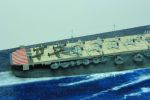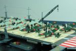 Das Holzdeck ist angenehm dünn und schön gelasert. Es weist feine Struktur auf und die einzelnen Deckplanken sind maßstabsgerecht wiedergegeben. Allerdings decken sich die drei Öffnungen der Aufzüge nicht mit denen des Holzdecks. Die größte Abweichung war am vorderen Aufzug. Dort wurde mittels eines Skalpells und Metalllineal durchtrennt und ein ca. 1 mm breiter Streifen abgeschnitten. Nun konnte die Klebefolie nach und nach abgezogen und auf die beiden Stücke auf das Plastikdeck geklebt werden. Die Haftung ist sehr gut, deshalb sollte dies beim ersten Versuch gelingen. Um die zusätzliche Höhe des Holzdecks auszugleichen, liegen für die drei Aufzüge fotogeätzte Teile bei. Am Bug und Heck gibt es ebenfalls Fotoätzteileile, die beim Original in Stahl gehalten sind. Diese fünf Teile wurden vorlackiert und auf die jeweilige Position geklebt. Zu diesem Zeitpunkt fiel auf, dass das Holzdeck bis an die Kante des Flugdecks reicht. Dies ist unschön, weil es für entlang der Kante fotogeätzte Laufwege gibt, die jetzt auf das hölzerne Flugdeck geklebt werden mussten und damit leicht auftragen.