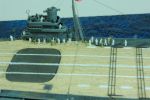 Die weißen Flugdeckmarkierungen und der rotweiße Bereich am Heck wurden mit Airbrush lackiert. Nur für den Windrichtungsanzeiger am Bug wurde das Abziehbild des Bausatzes verwendet. Da mir der Holzfarbton zu hell war, benutzte ich einen weichen Bleistift, setzte diesen flach an und trug solange Graphit auf, bis ich mit dem Farbton zufrieden war.