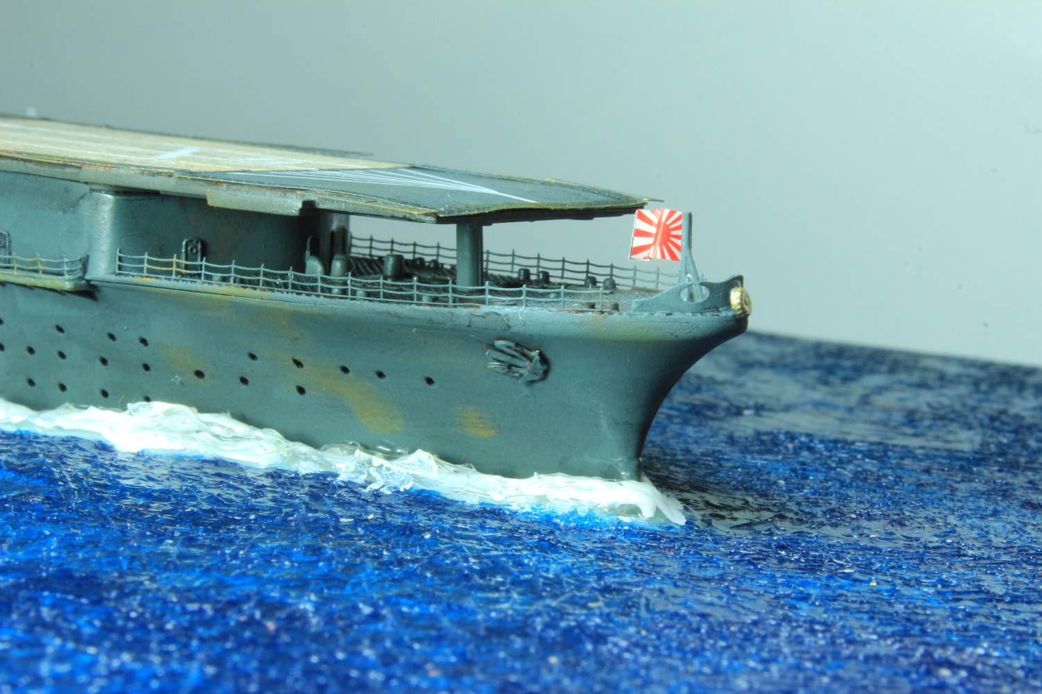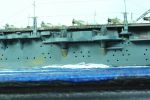 Im einteiligen Rumpf wurden zu Beginn alle Bullaugen mit einem 0,3 mm dicken Bohrer aufgebohrt, um damit eine größere Tiefenwirkung zu erreichen. Anschließend konnte die Wasserlinienplatte eingeklebt, verspachtelt und leicht verschliffen werden. Auf die beiden Metallplatten verzichtete ich. Stattdessen bohrte ich ein Loch in die Bodenplatten und klebte eine Mutter auf deren Oberseite ein. Damit verschraubte ich später das Modell mit dem Wasserdisplay. Es folgte die Montage der Decks an Bug und Deck. Die Montage der Waffenplattformen, der Schornsteine und der sogenannten Schwalbennester ging flott vonstatten. Im Anschluss daran klebte ich die Reling an die Deckkanten des Rumpfes und einige seefeste Türen an die Wände in Bereich der Waffenplattformen. Es folgte eine Lackierung in IJN02 Kure Gray von WEM. Die Unterseite des Flugdecks und die Insel wurden ebenfalls lackiert. Die Bewaffnung wurde zu diesem Zeitpunkt noch nicht angebracht da diese teilweise ausgetauscht, separat lackiert und erst später angebracht werden sollte.