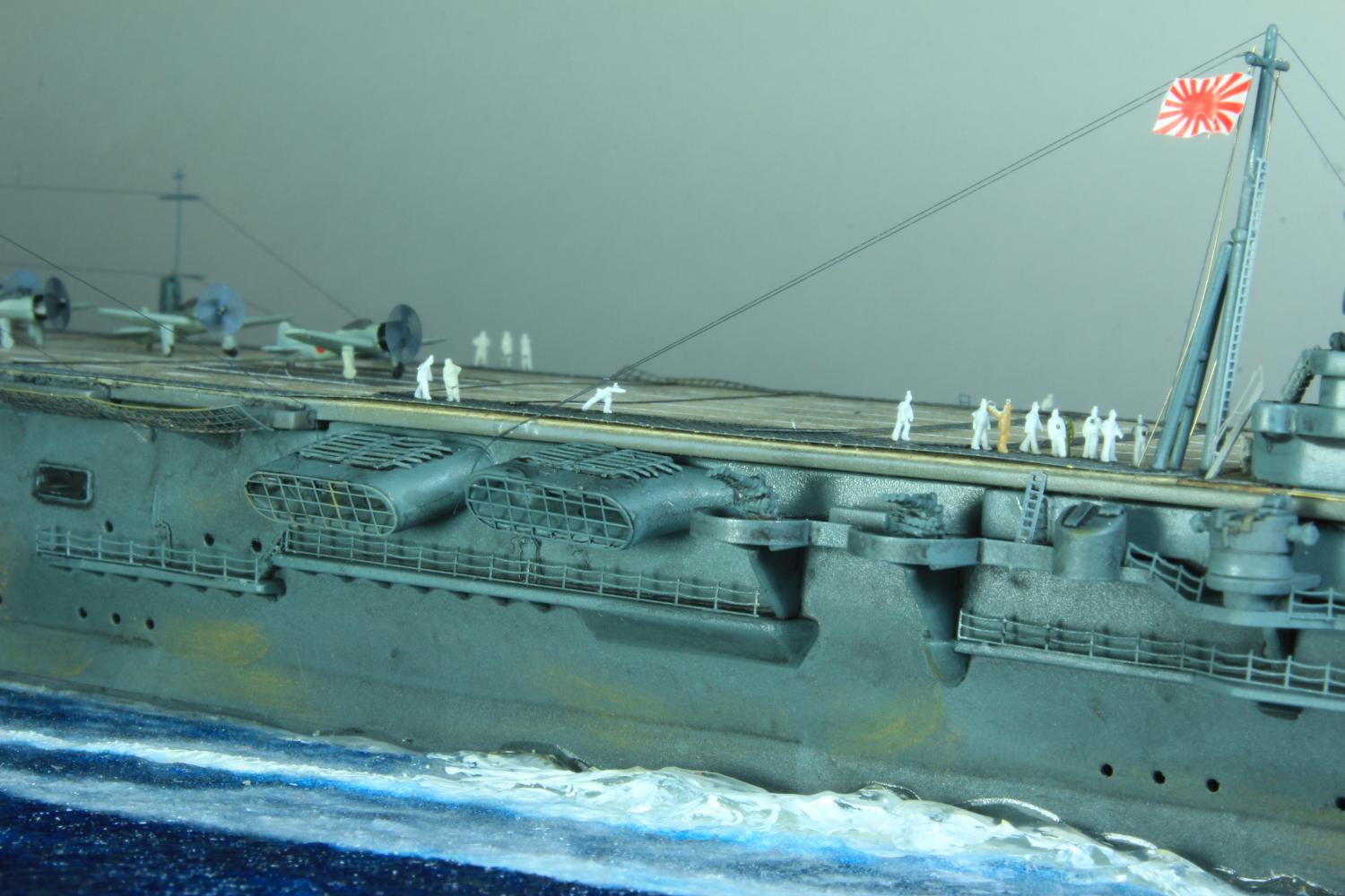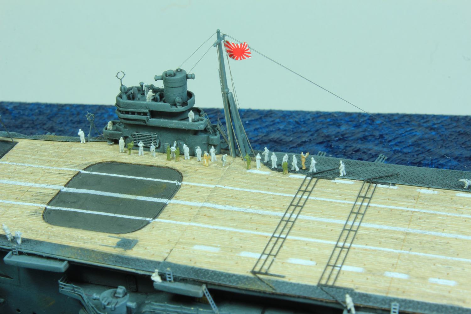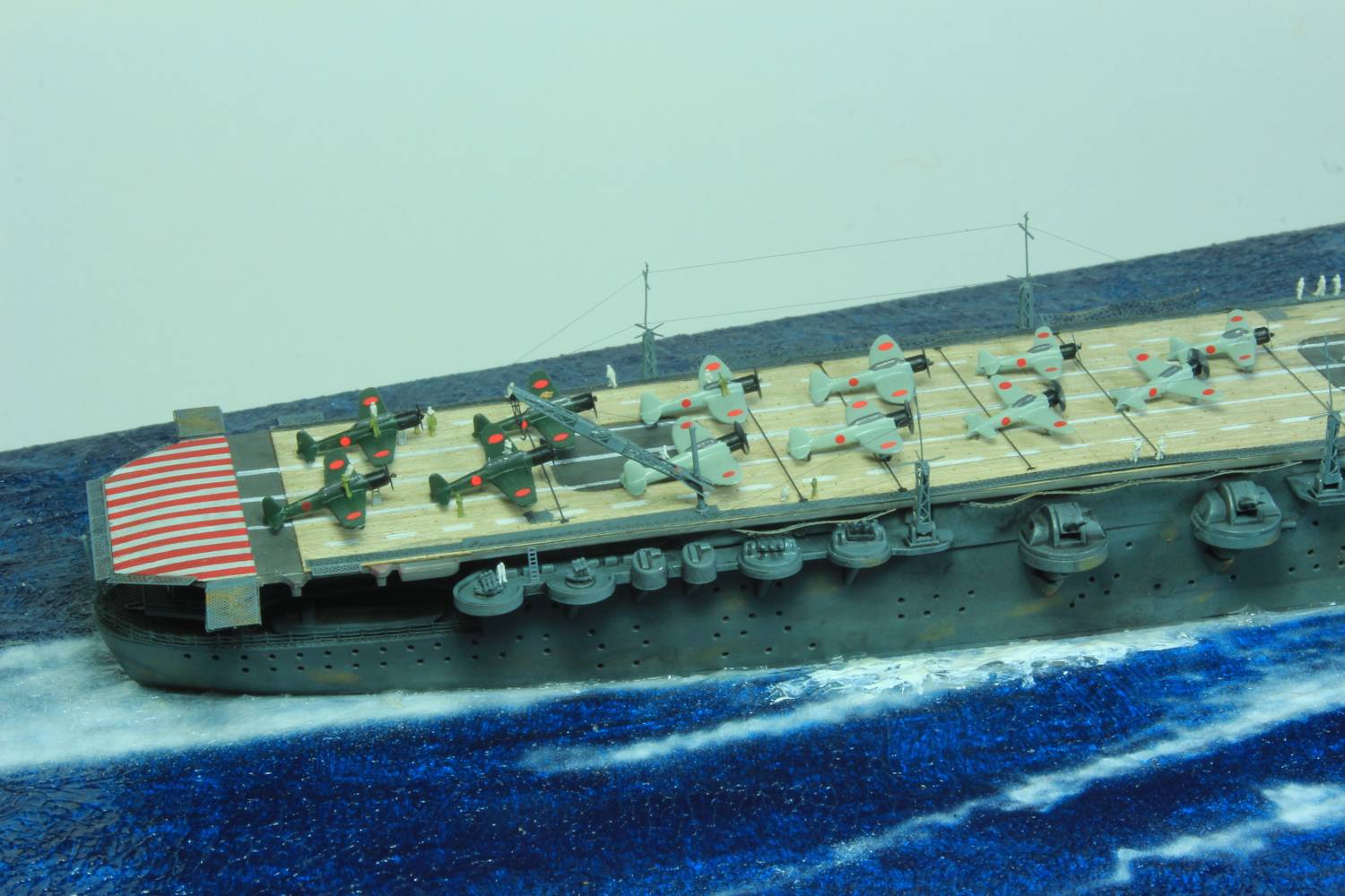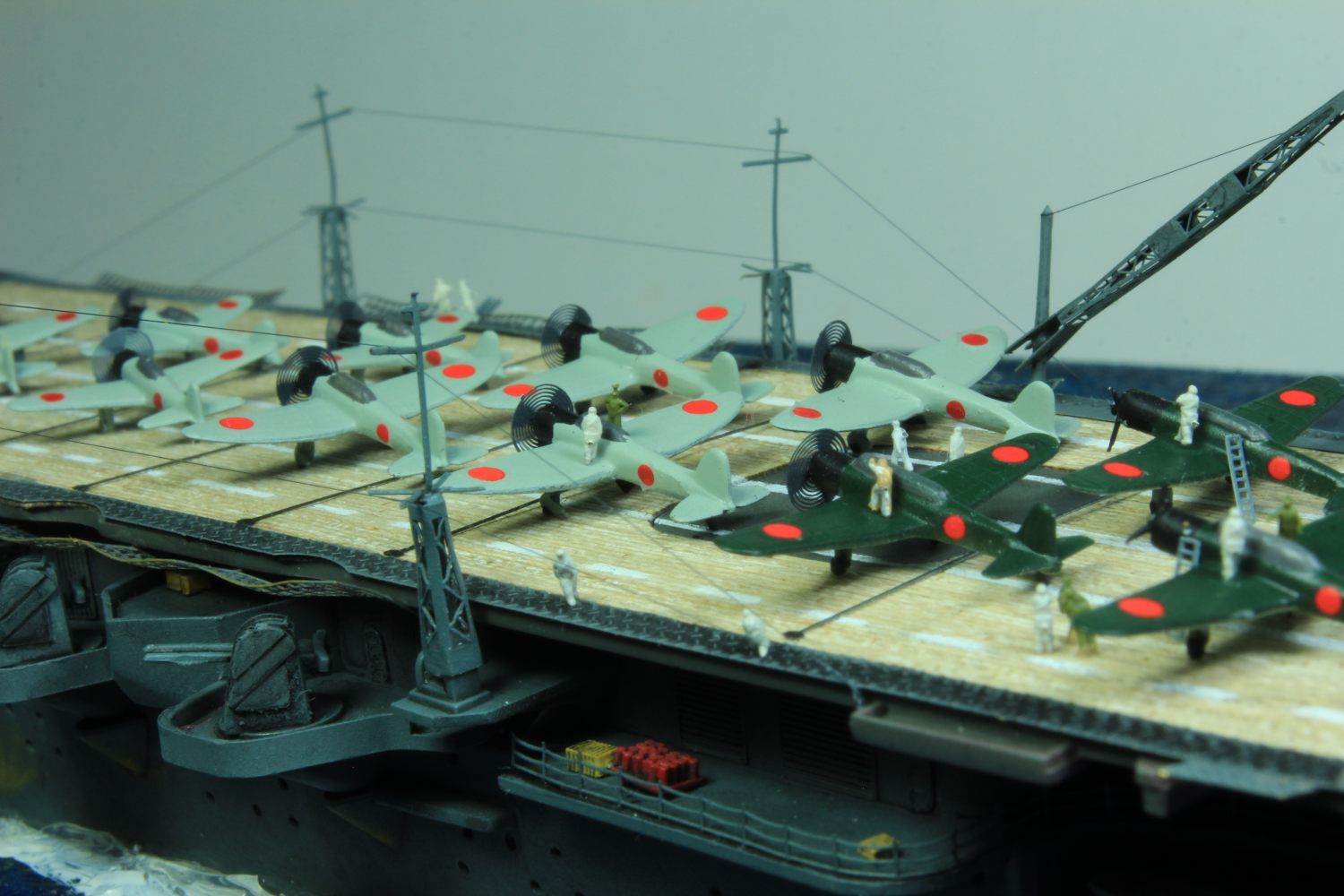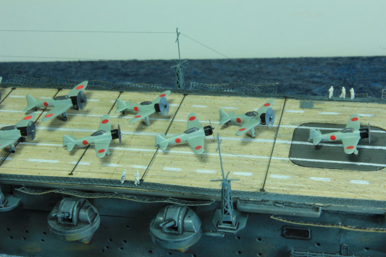 Die finale Montage bestand im Anbringen der Insel, des Dreibeinmastes, der vier fotogeätzten Gitterantennen, der Flugabwehrbewaffnung, des Windabweisers, des Bordkranes und der Fangseile. Nun konnten die Flugzeuge positioniert werden. Bei den Zeros und den Vals laufen die Motoren schon, bei den Kates stehen diese noch. Die von ION stammenden „Imperial Japanese Navy Carrier Personel & Pilots“ sind extrem gut. Die Körperhaltungen sind selbst nach dem Lackieren noch gut zu erkennen. Die Matrosen bekamen einen weißen und die Piloten einen grünen Anstrich mittels Pinsel. Im letzten Arbeitsgang konnten die Antennen und Flaggenleinen angebracht werden.