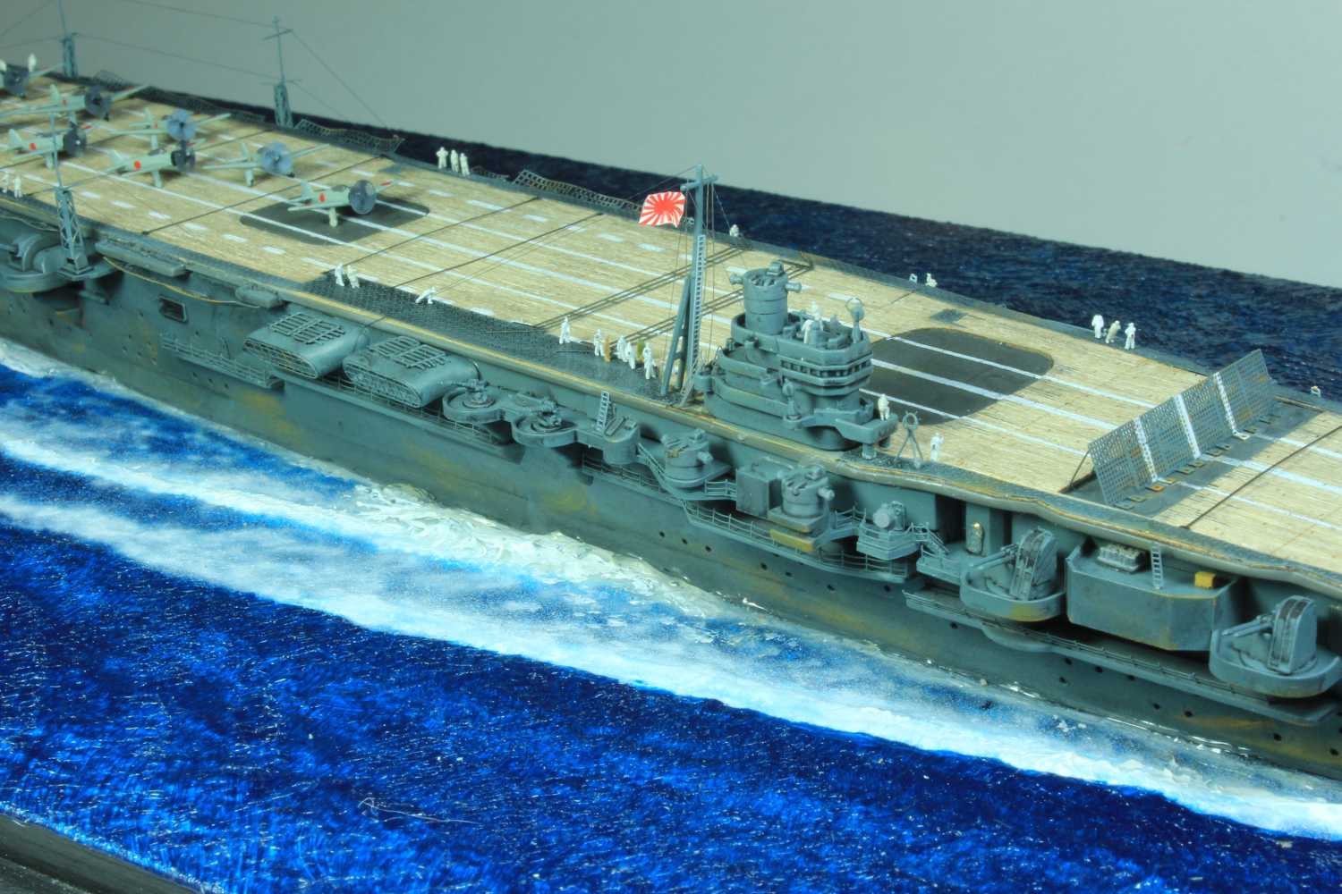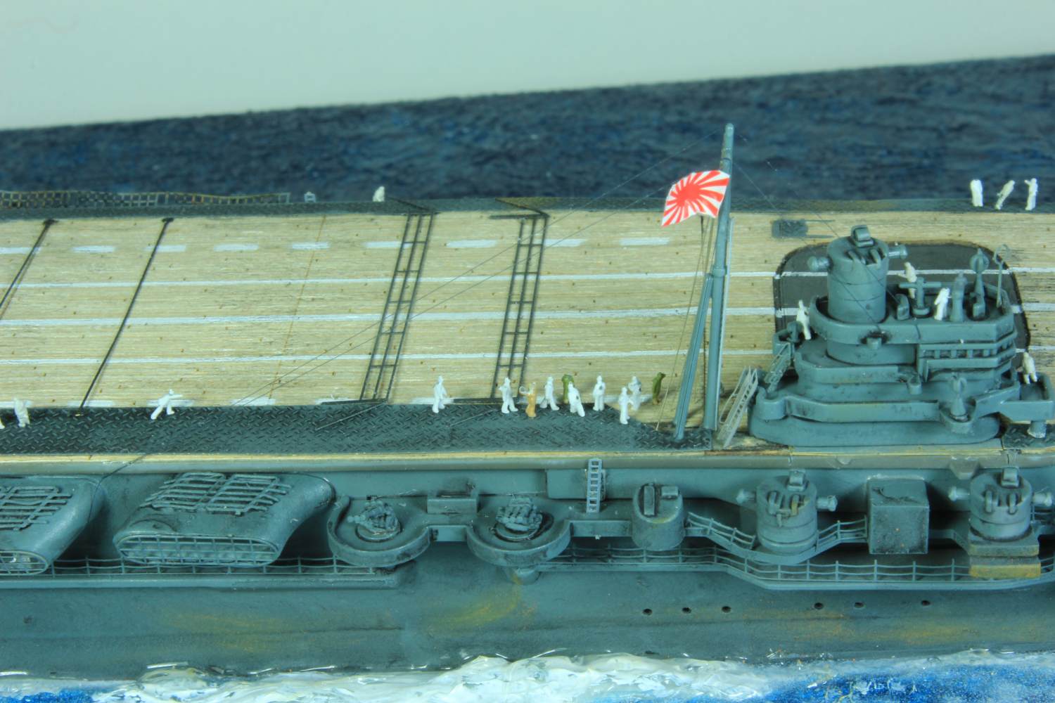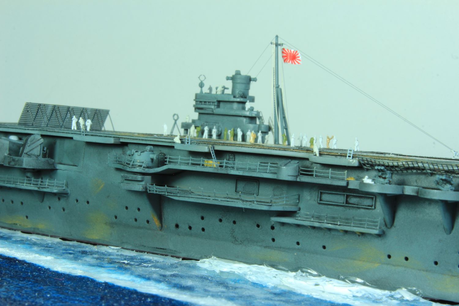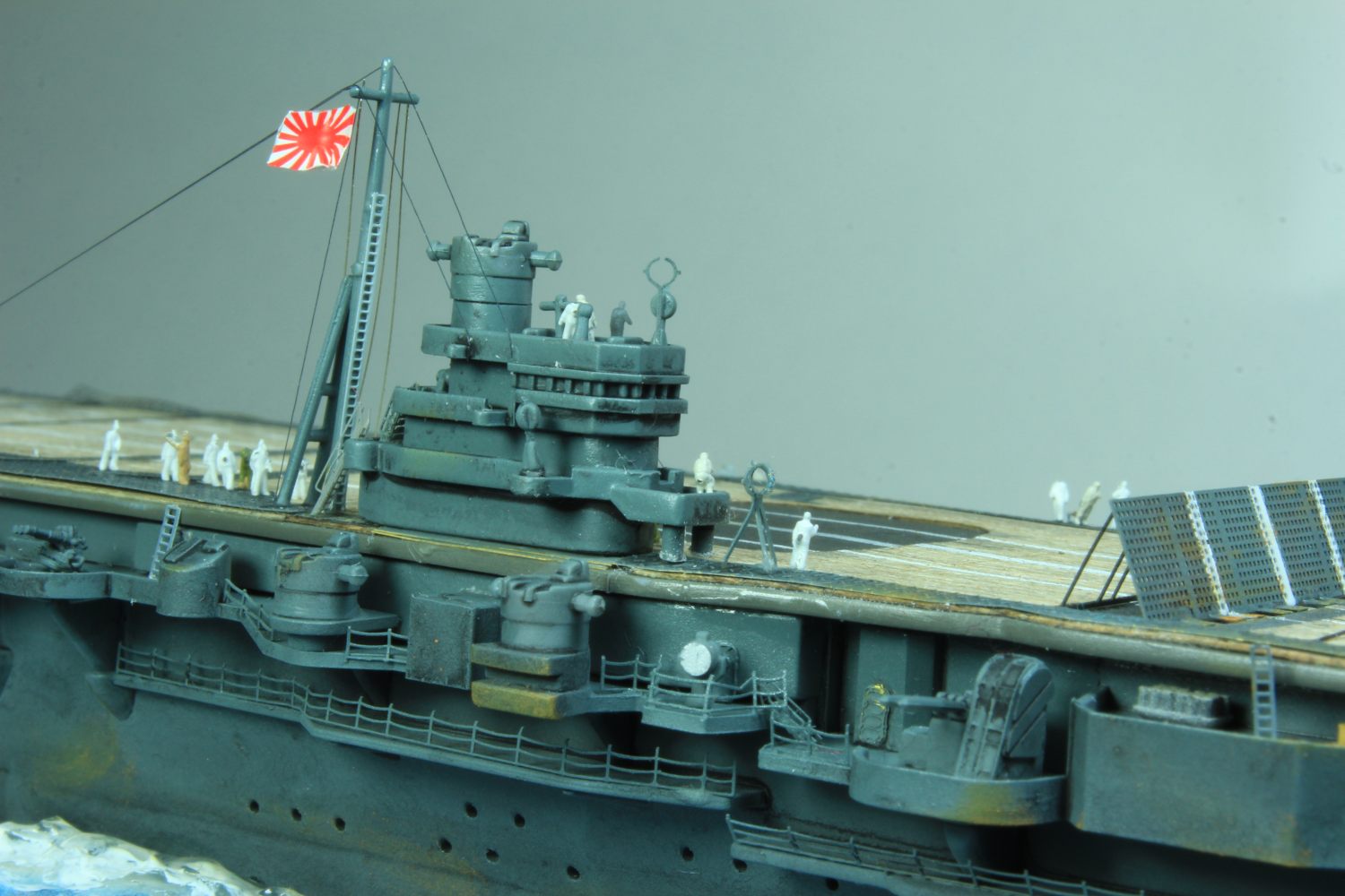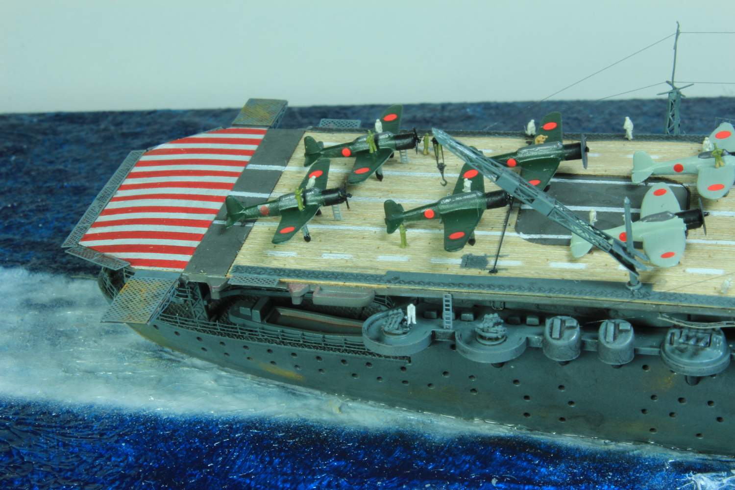 Die finale Montage bestand im Anbringen der Insel, des Dreibeinmastes, der vier fotogeätzten Gitterantennen, der Flugabwehrbewaffnung, des Windabweisers, des Bordkranes und der Fangseile. Nun konnten die Flugzeuge positioniert werden. Bei den Zeros und den Vals laufen die Motoren schon, bei den Kates stehen diese noch. Die von ION stammenden „Imperial Japanese Navy Carrier Personel & Pilots“ sind extrem gut. Die Körperhaltungen sind selbst nach dem Lackieren noch gut zu erkennen. Die Matrosen bekamen einen weißen und die Piloten einen grünen Anstrich mittels Pinsel. Im letzten Arbeitsgang konnten die Antennen und Flaggenleinen angebracht werden.