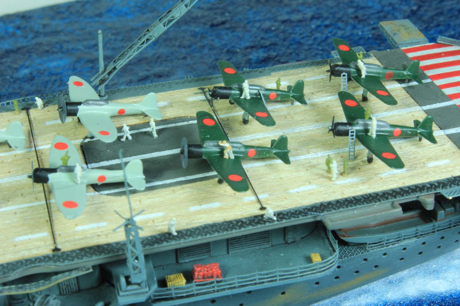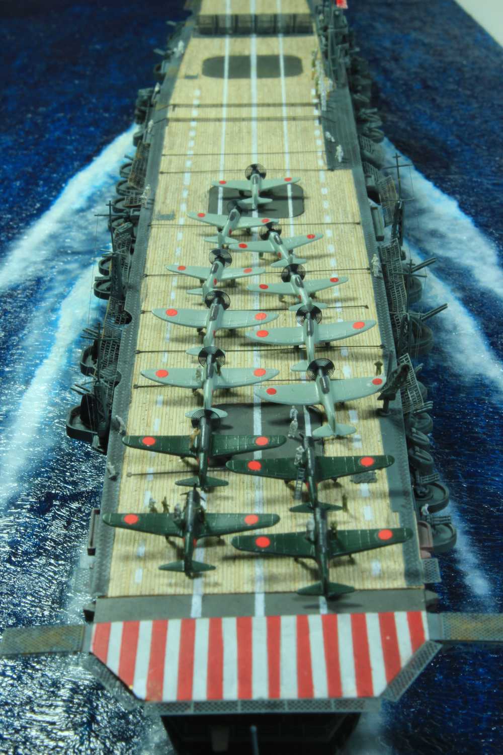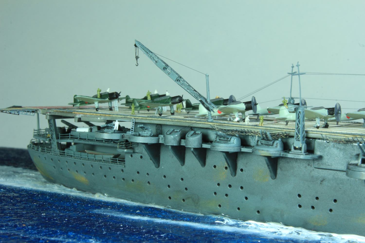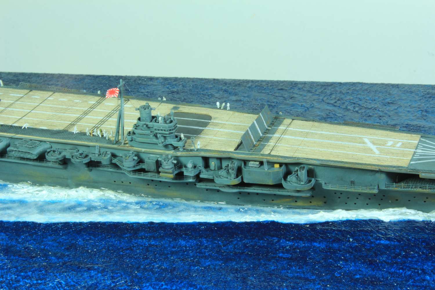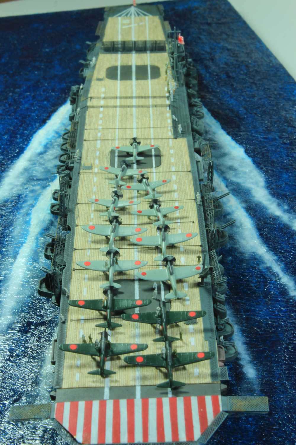 Die finale Montage bestand im Anbringen der Insel, des Dreibeinmastes, der vier fotogeätzten Gitterantennen, der Flugabwehrbewaffnung, des Windabweisers, des Bordkranes und der Fangseile. Nun konnten die Flugzeuge positioniert werden. Bei den Zeros und den Vals laufen die Motoren schon, bei den Kates stehen diese noch. Die von ION stammenden „Imperial Japanese Navy Carrier Personel & Pilots“ sind extrem gut. Die Körperhaltungen sind selbst nach dem Lackieren noch gut zu erkennen. Die Matrosen bekamen einen weißen und die Piloten einen grünen Anstrich mittels Pinsel. Im letzten Arbeitsgang konnten die Antennen und Flaggenleinen angebracht werden.