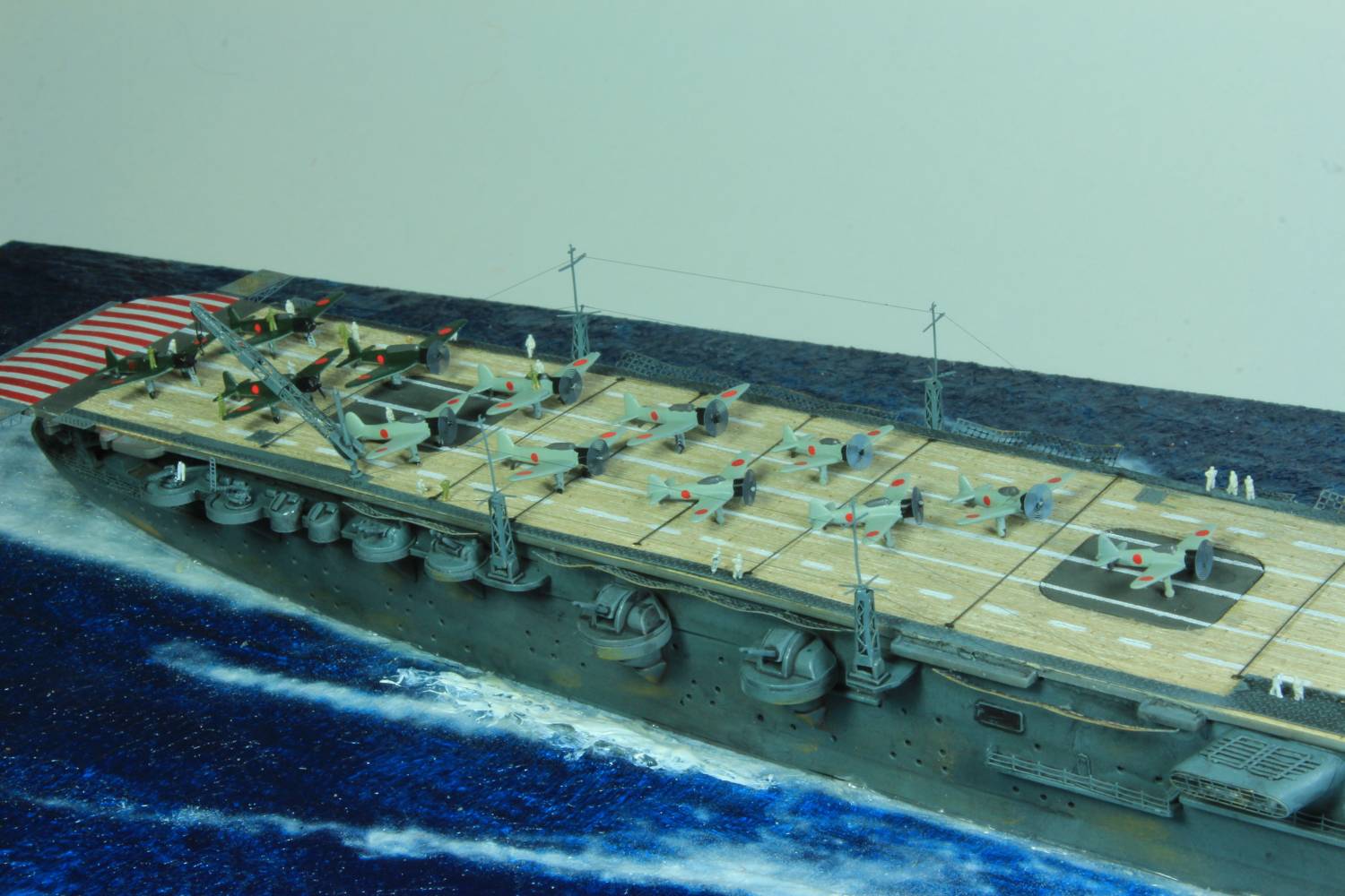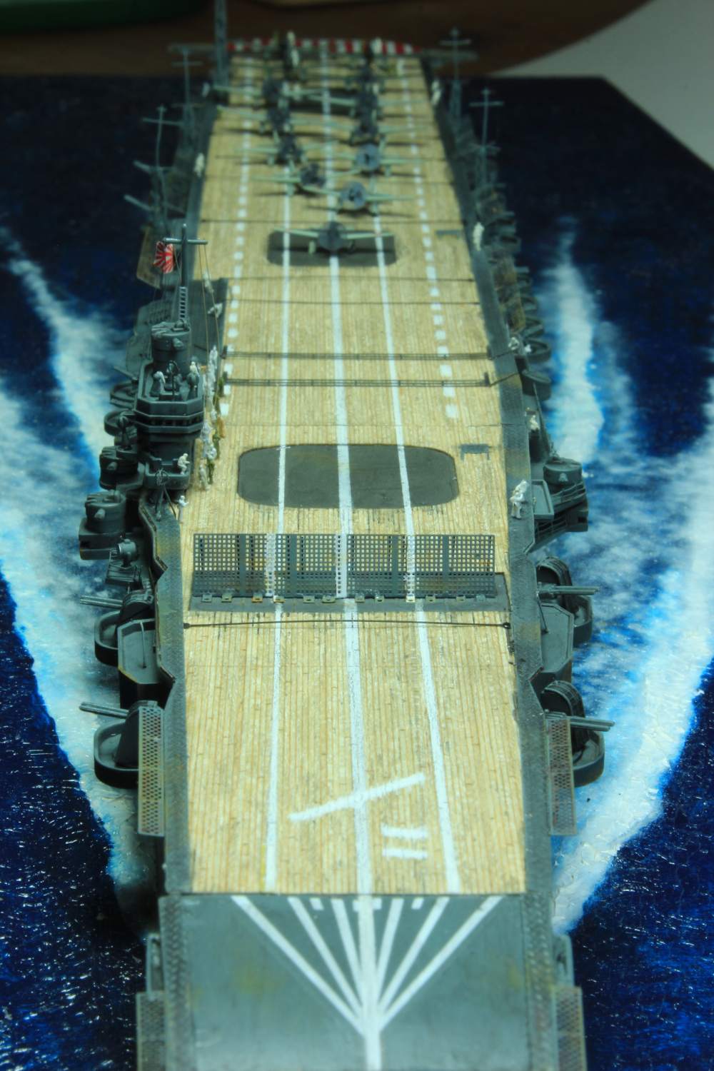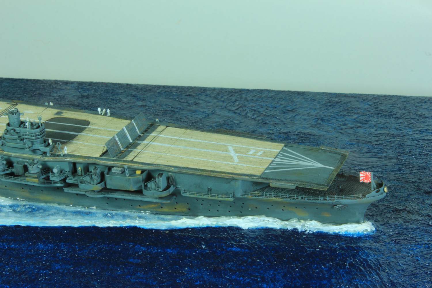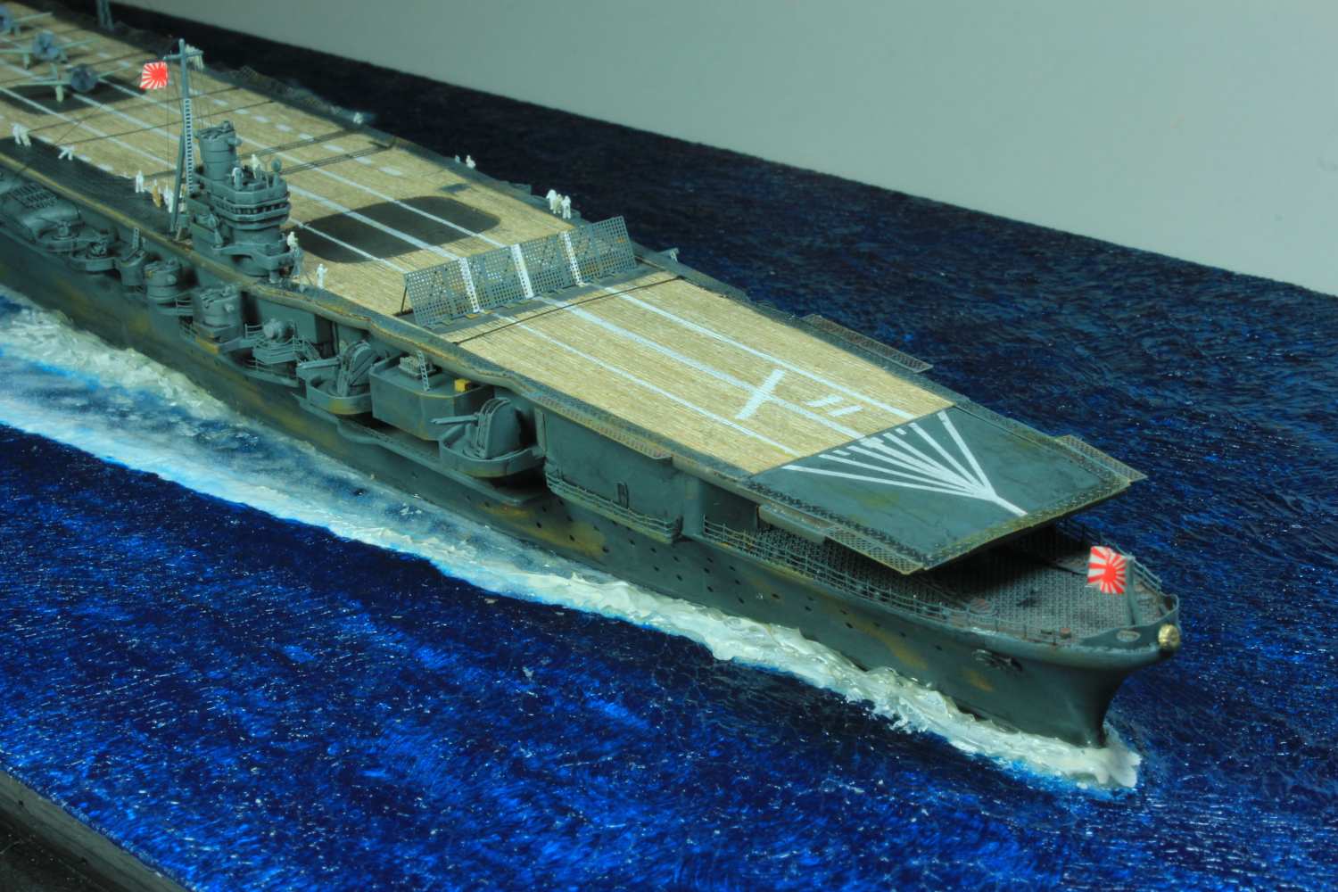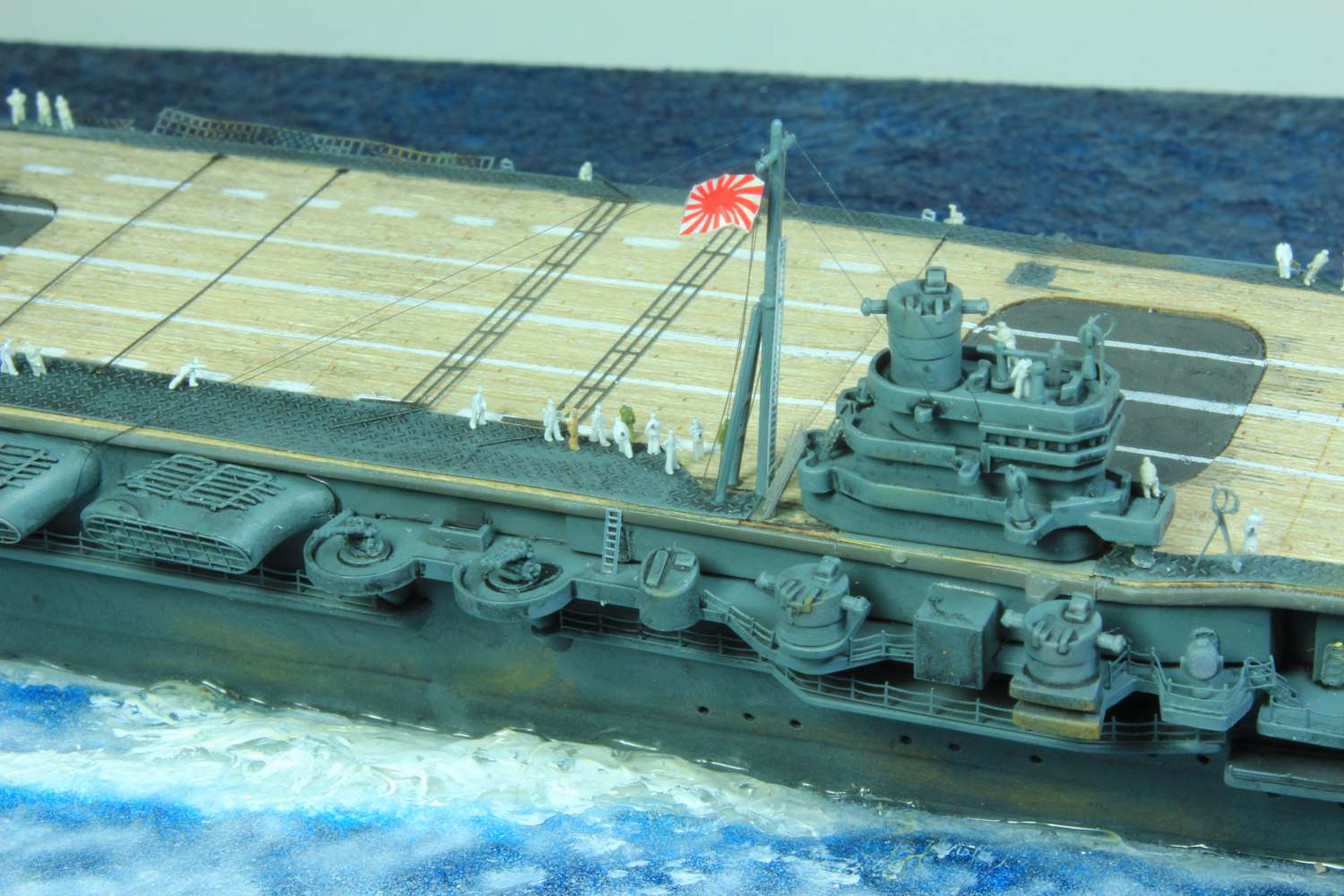 Die finale Montage bestand im Anbringen der Insel, des Dreibeinmastes, der vier fotogeätzten Gitterantennen, der Flugabwehrbewaffnung, des Windabweisers, des Bordkranes und der Fangseile. Nun konnten die Flugzeuge positioniert werden. Bei den Zeros und den Vals laufen die Motoren schon, bei den Kates stehen diese noch. Die von ION stammenden „Imperial Japanese Navy Carrier Personel & Pilots“ sind extrem gut. Die Körperhaltungen sind selbst nach dem Lackieren noch gut zu erkennen. Die Matrosen bekamen einen weißen und die Piloten einen grünen Anstrich mittels Pinsel. Im letzten Arbeitsgang konnten die Antennen und Flaggenleinen angebracht werden.
