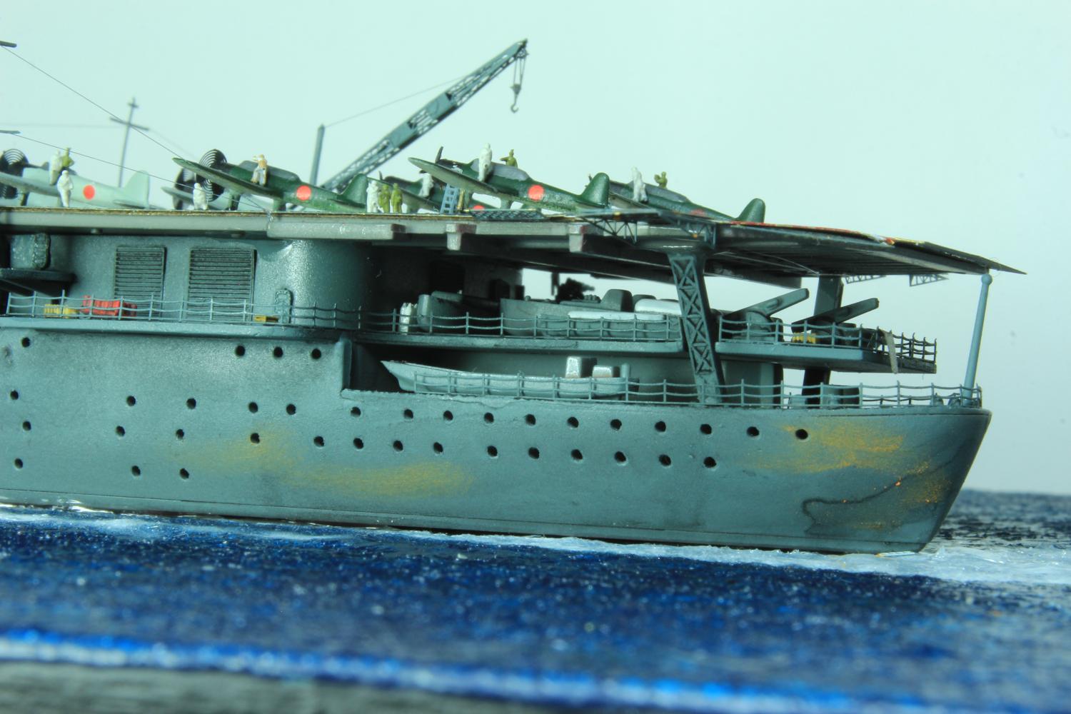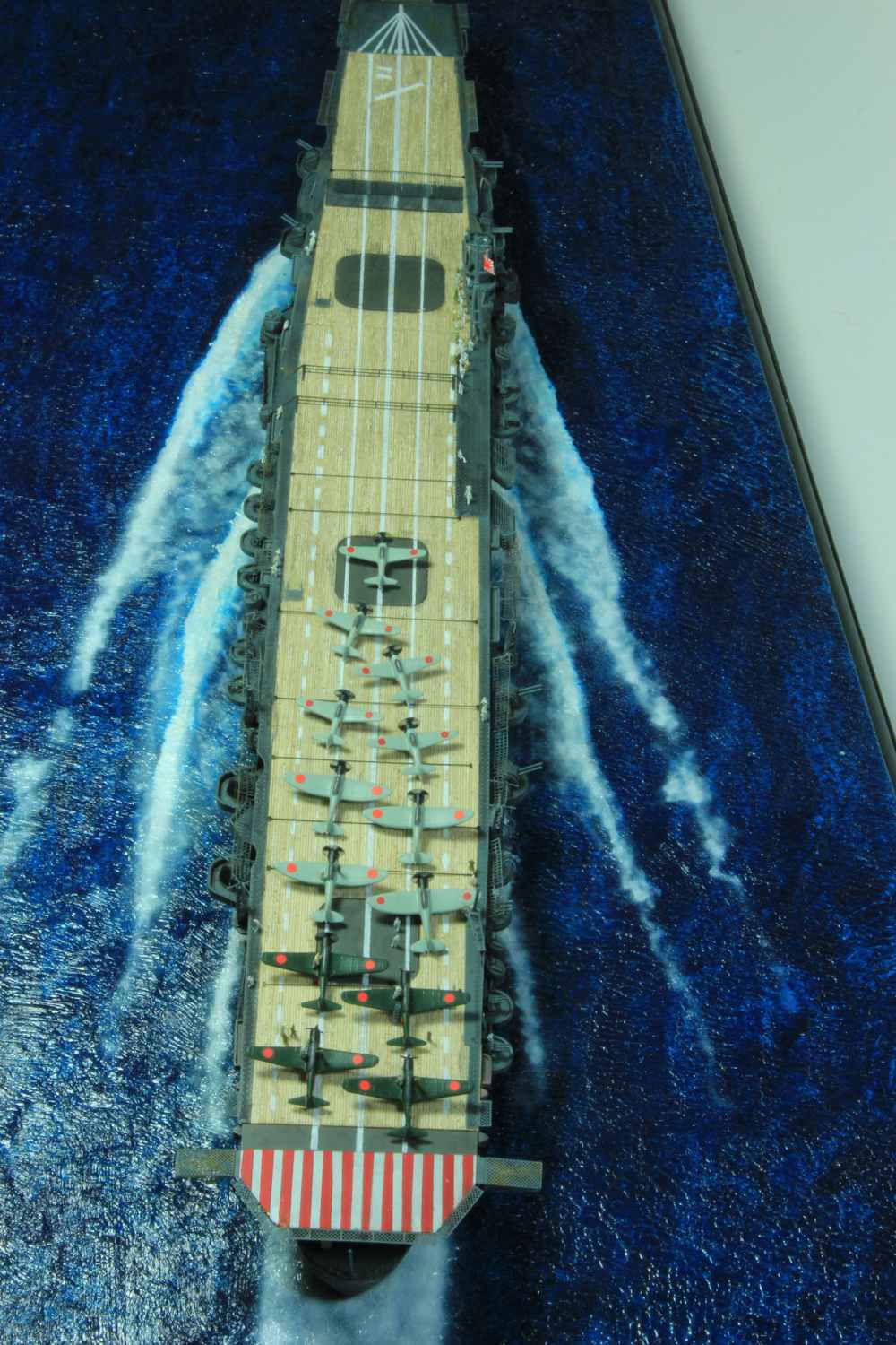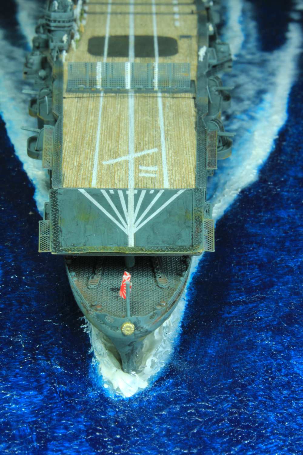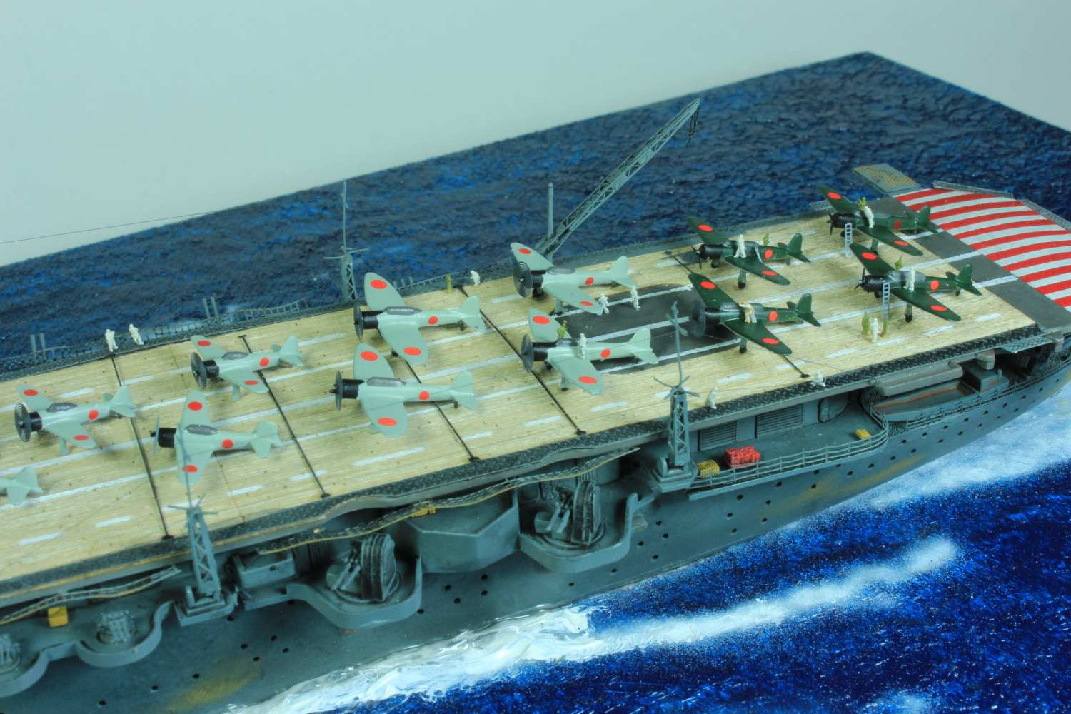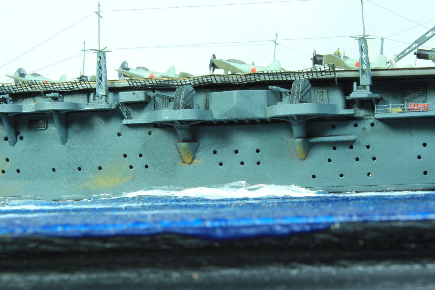 Die finale Montage bestand im Anbringen der Insel, des Dreibeinmastes, der vier fotogeätzten Gitterantennen, der Flugabwehrbewaffnung, des Windabweisers, des Bordkranes und der Fangseile. Nun konnten die Flugzeuge positioniert werden. Bei den Zeros und den Vals laufen die Motoren schon, bei den Kates stehen diese noch. Die von ION stammenden „Imperial Japanese Navy Carrier Personel & Pilots“ sind extrem gut. Die Körperhaltungen sind selbst nach dem Lackieren noch gut zu erkennen. Die Matrosen bekamen einen weißen und die Piloten einen grünen Anstrich mittels Pinsel. Im letzten Arbeitsgang konnten die Antennen und Flaggenleinen angebracht werden.