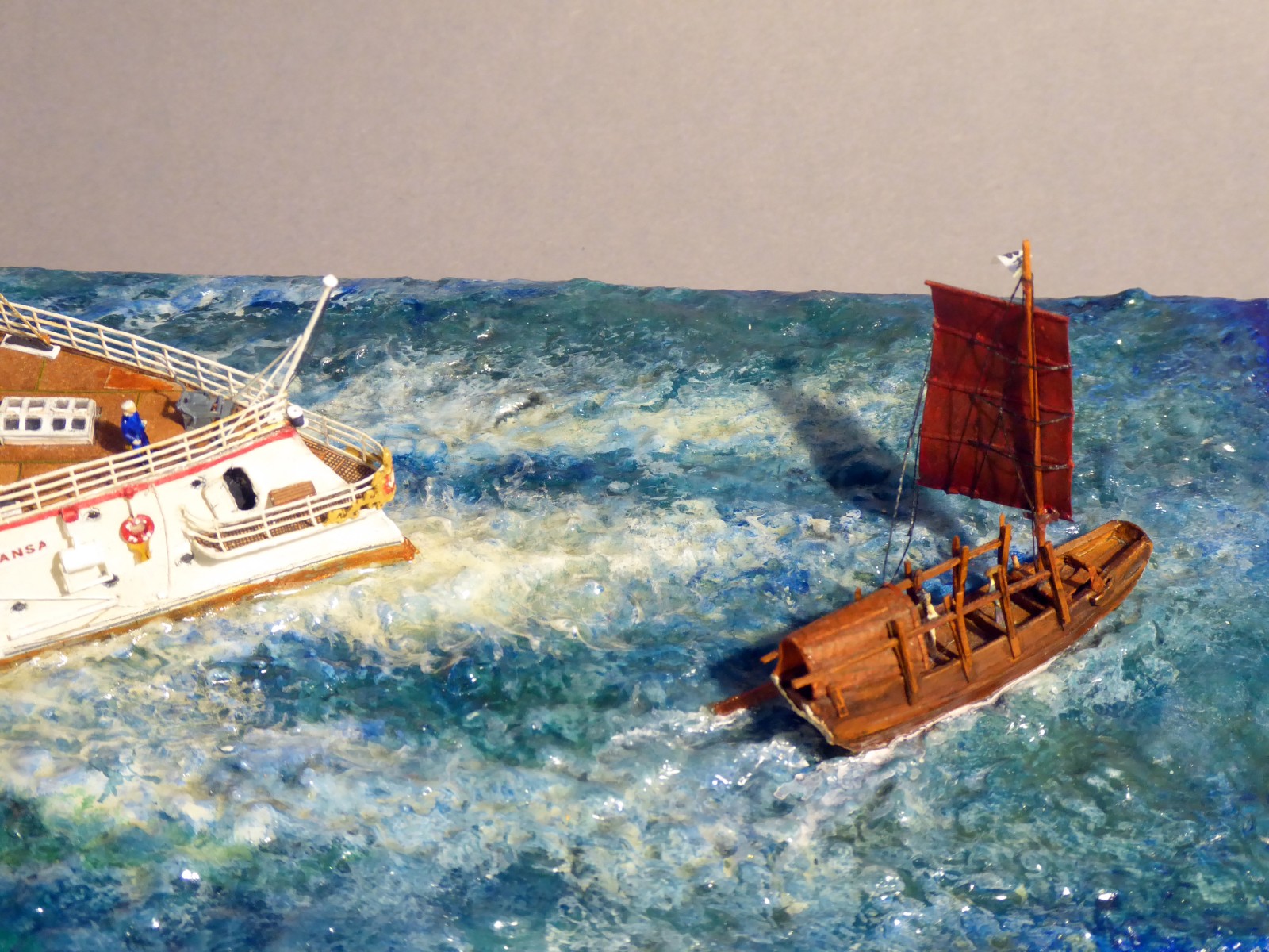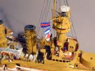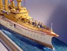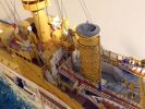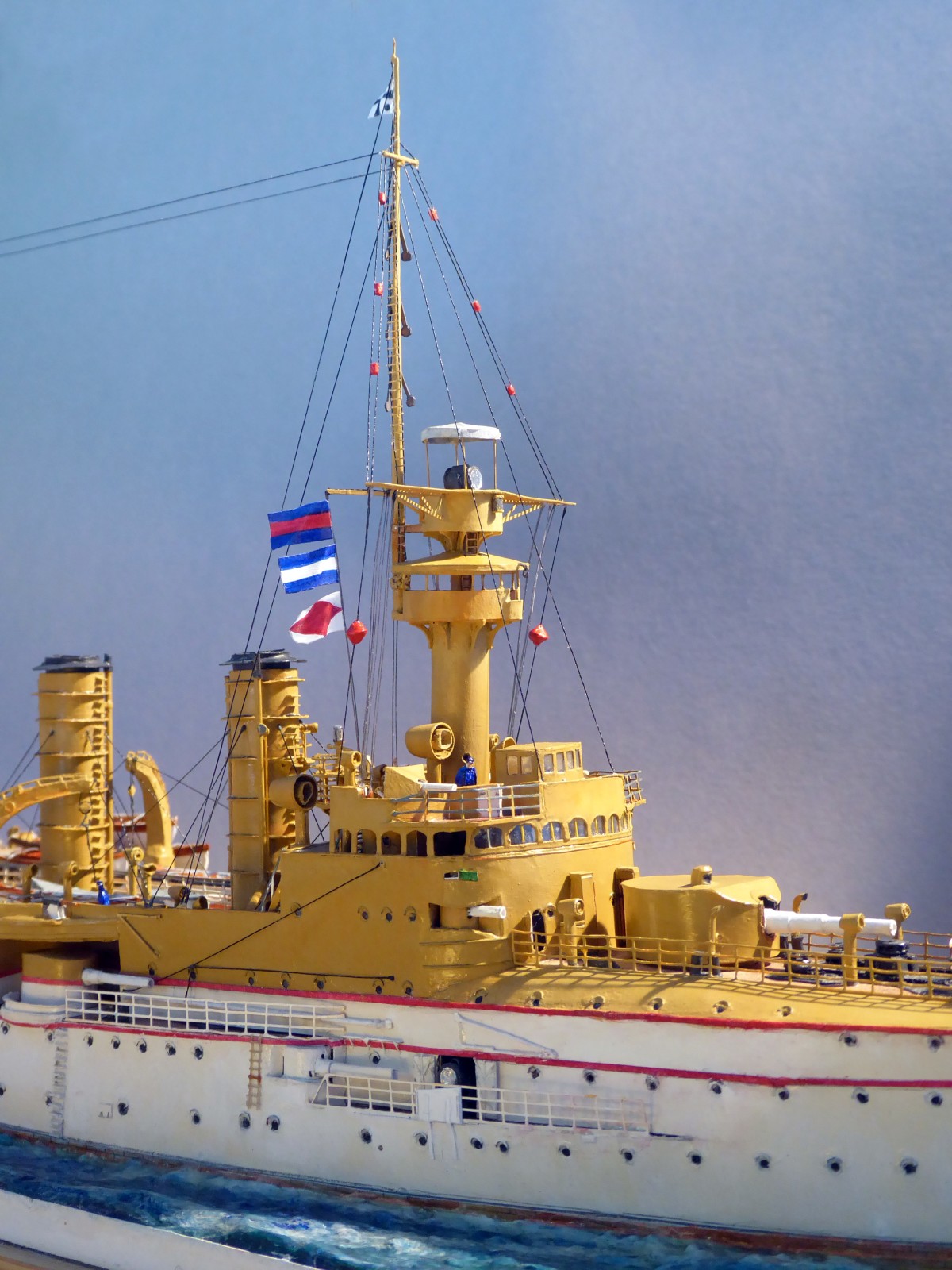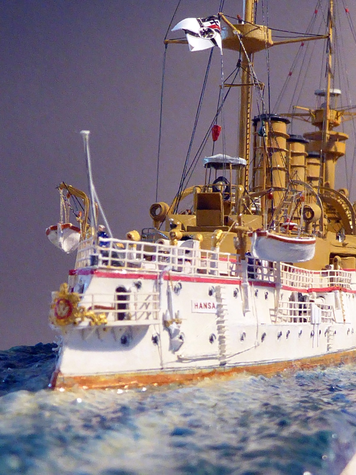 Das Modell ist auf Kartonspanten gebaut, 45 cm lang, 8 cm breit und 17 cm hoch. Die meisten Bauteile sind mit Acrylfarbe angemalt. Der Einsatz von Lasercutteilen kam hinzu. Ich stellte S.M.S. Hansa mit halber Kraft fahrend in einer Acrylgel-Wasserfläche dar. Der Anstrich entspricht den Vorschriften für Auslandsschiffe und folgt historischen Fotos des Originals (der HMV-Bogen liegt in diesem Punkt nicht in allen Bereichen richtig). Mein Modell zeigt das Schiff, wie es Vizeadmiral Bendemann in chinesischen Gewässern diente (seine Flagge weht am Fockmast). Das Modell war mit seinen komplizierten Rumpfformen, den vielen Aufbauten und zig-Lüftern aufwendig – ich arbeitete mit Unterbrechungen drei Jahre daran. Anstelle einer Rah gab es am Fockmast eine gitterförmige Plattform zur Führung von Signalleinen. An deren Nocken zeige ich die halbgesetzten roten Dampfbälle – das Schiff fährt mit halber Kraft. Die Kombination der Signalflaggen bedeutet: »Der Admiral wünscht sie zu sprechen«. Die Semaphor-Anlage mit Winkern an beiden Stengen waren seitlich und vorn ablesbar. Nachts dienten Dreierlampen-Anlagen zur Signalübermittlung. Achtern kreuzt ein chinesisches Flussschifferboot das Kielwasser. Als Hinweis, in welcher Weltgegend mein Dampfer unterwegs sein soll.
