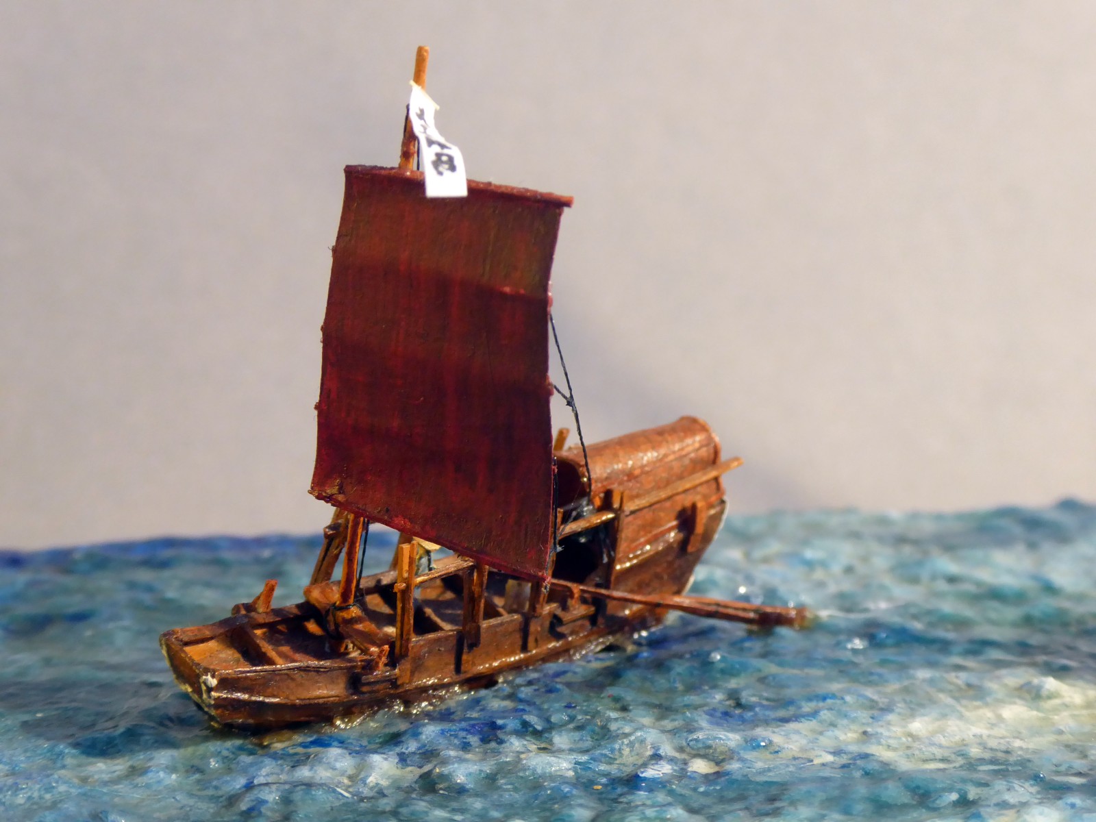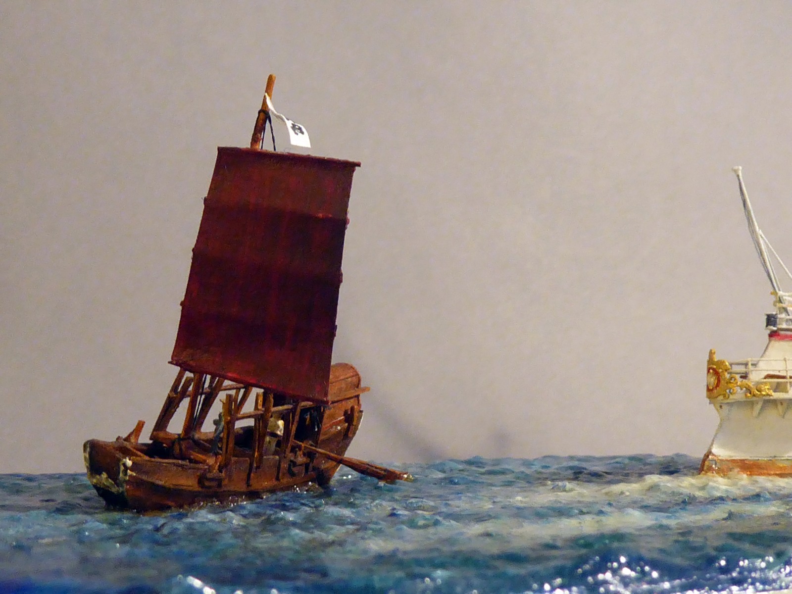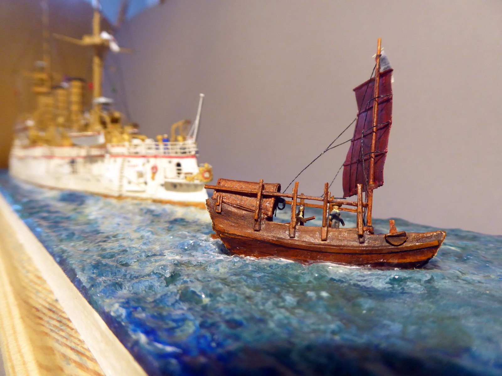 Das Modell ist auf Kartonspanten gebaut, 45 cm lang, 8 cm breit und 17 cm hoch. Die meisten Bauteile sind mit Acrylfarbe angemalt. Der Einsatz von Lasercutteilen kam hinzu. Ich stellte S.M.S. Hansa mit halber Kraft fahrend in einer Acrylgel-Wasserfläche dar. Der Anstrich entspricht den Vorschriften für Auslandsschiffe und folgt historischen Fotos des Originals (der HMV-Bogen liegt in diesem Punkt nicht in allen Bereichen richtig). Mein Modell zeigt das Schiff, wie es Vizeadmiral Bendemann in chinesischen Gewässern diente (seine Flagge weht am Fockmast). Das Modell war mit seinen komplizierten Rumpfformen, den vielen Aufbauten und zig-Lüftern aufwendig – ich arbeitete mit Unterbrechungen drei Jahre daran. Anstelle einer Rah gab es am Fockmast eine gitterförmige Plattform zur Führung von Signalleinen. An deren Nocken zeige ich die halbgesetzten roten Dampfbälle – das Schiff fährt mit halber Kraft. Die Kombination der Signalflaggen bedeutet: »Der Admiral wünscht sie zu sprechen«. Die Semaphor-Anlage mit Winkern an beiden Stengen waren seitlich und vorn ablesbar. Nachts dienten Dreierlampen-Anlagen zur Signalübermittlung. Achtern kreuzt ein chinesisches Flussschifferboot das Kielwasser. Als Hinweis, in welcher Weltgegend mein Dampfer unterwegs sein soll.