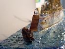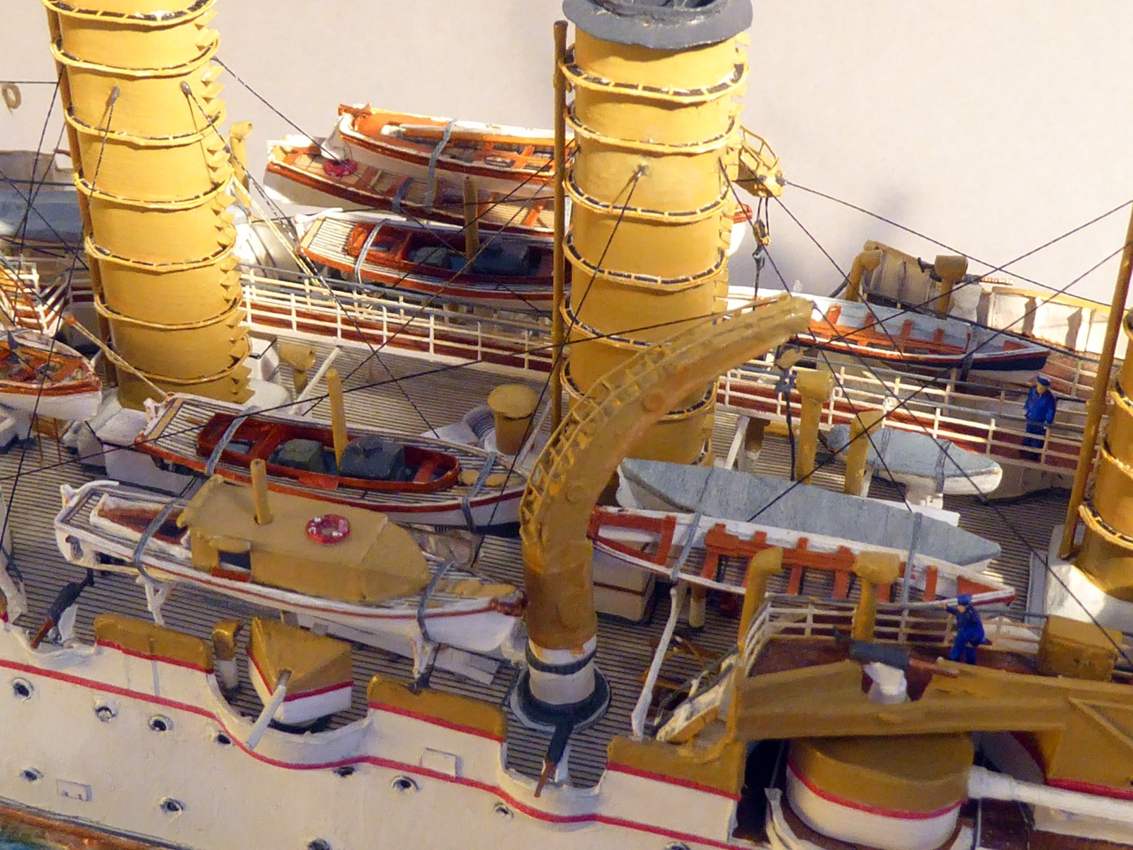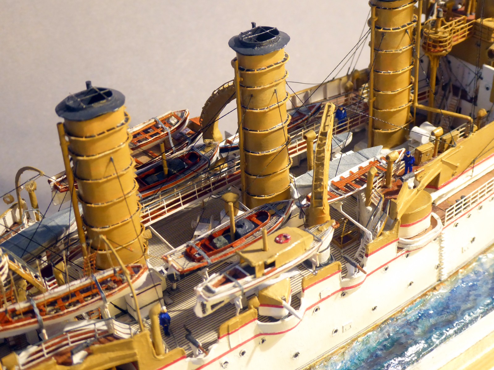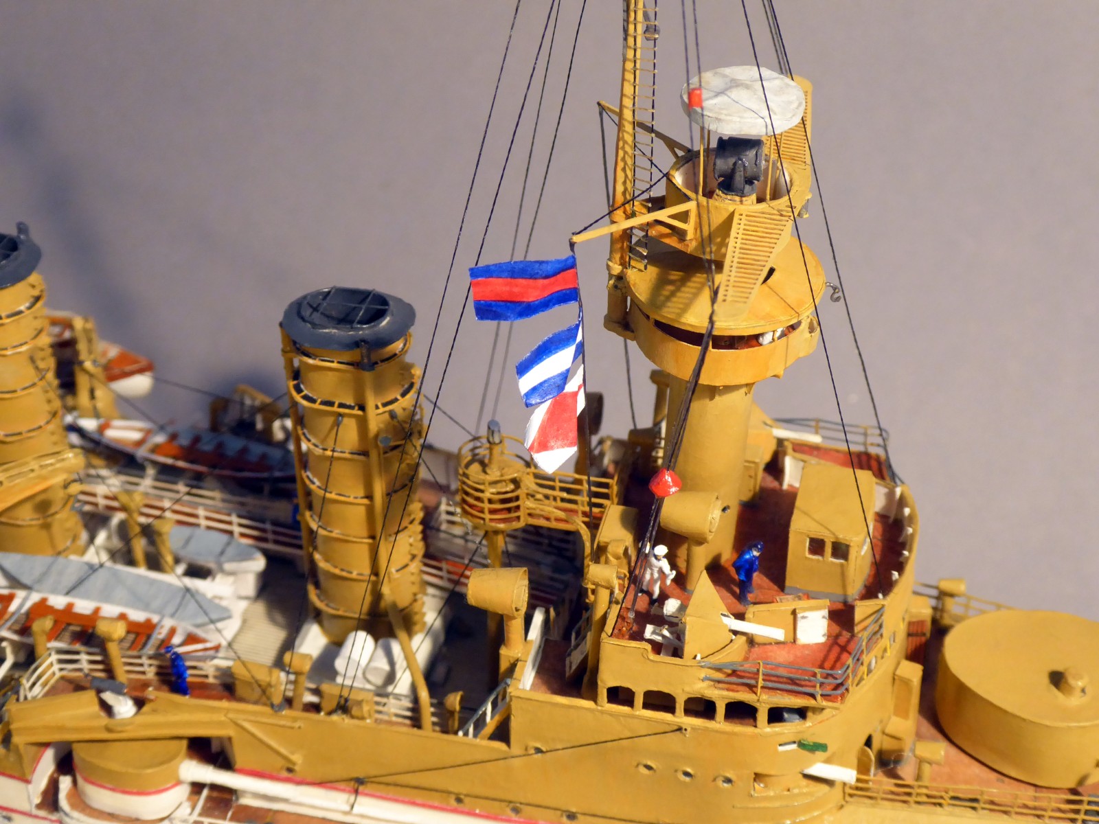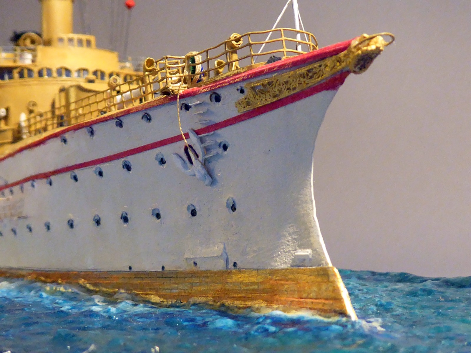 Bei meinem Umbau »von Victoria Louise zu Hansa« prüfte ich mühsam jedes Bauteil. Auffällig bei S.M.S. Hansa gegenüber ihren Schwesterschiffen: der Muntzmetallbeschlag über der Wasserlinie (eines ihrer Alleinstellungsmerkmale), andere Lüfterverteilung als bei den Schwestern (z.B. der große Kastenlüfter hinter dem achteren Kommandoturm), abweichende Bullaugen- und Fensteranzahl (z.B. vier Fenster an der Front des Ruderhauses) und vieles mehr. Ein markantes Merkmal ist der untere rote Streifen am Rumpf. Nur bei Hansa läuft er im Bugbereich in einem Bogen unter die Bugzier. S.M.S. Hertha führte ebenfalls zwei Streifen, bei ihr blieben sie jedoch auf ganzer Rumpflänge parallel. Sind das unwichtige Kleinigkeiten? Ich finde nicht – solche Details machen eine gute Recherche und damit auch ein gutes Modell aus.