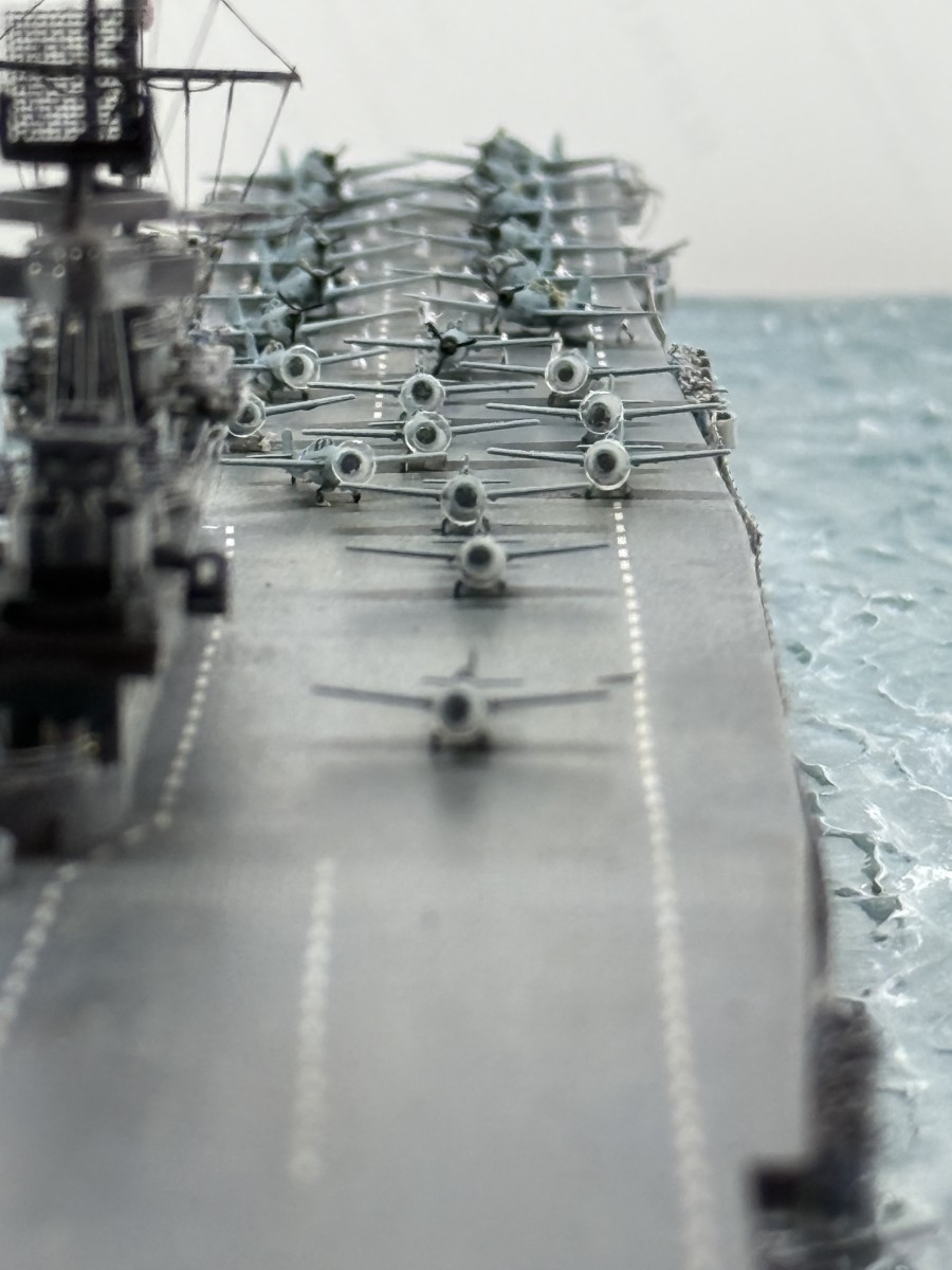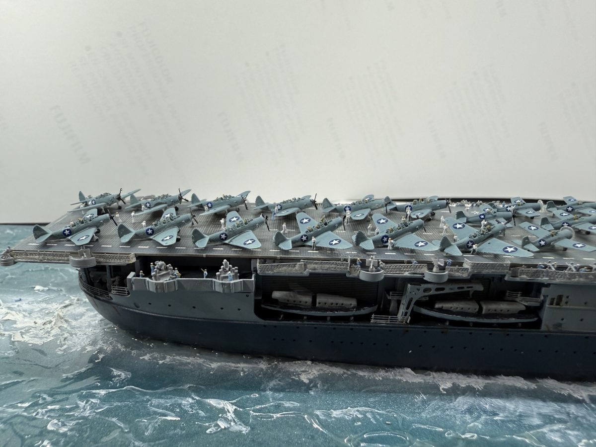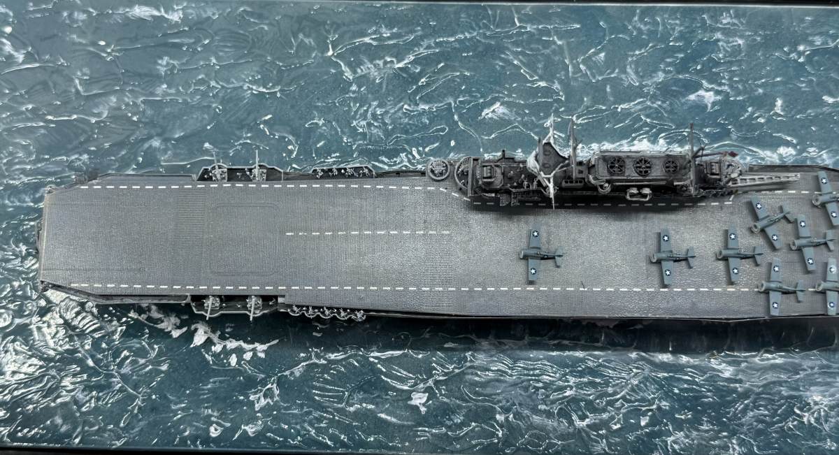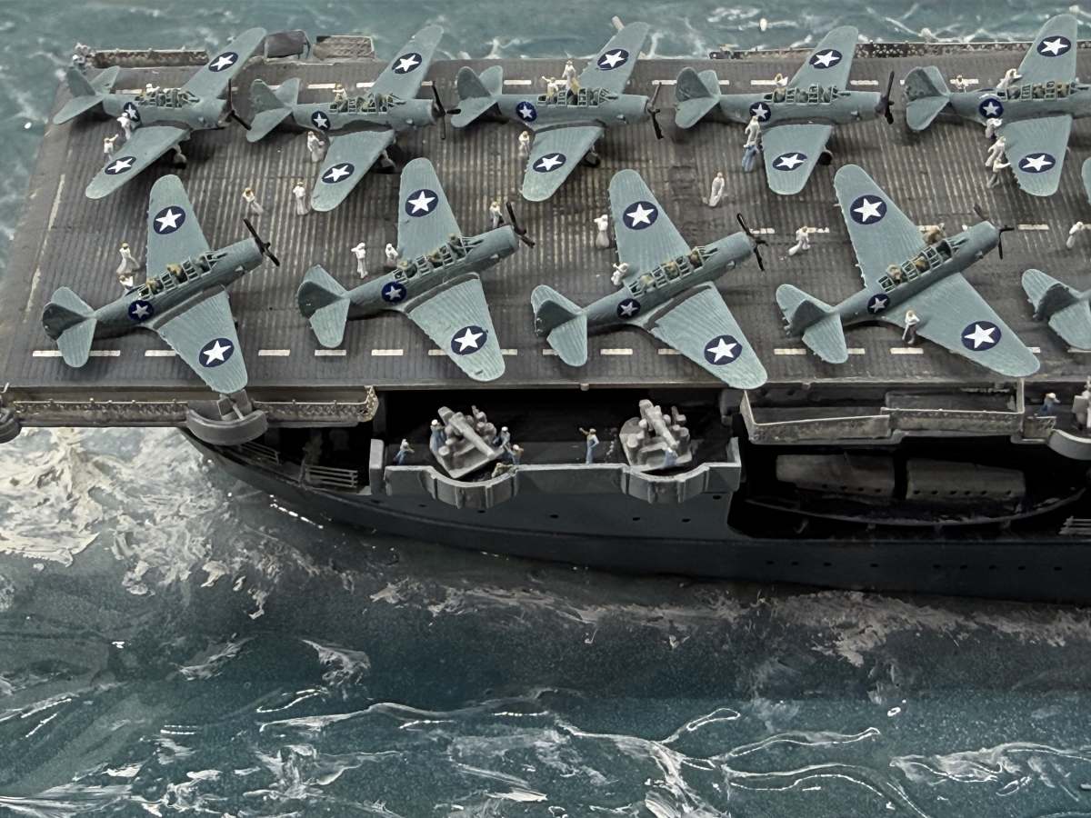 Die USS Yorktown zeigt den Zustand am 4. Juni 1942 gegen 8:50 (Hawaii Standardzeit), als eine der ersten ersten Wellen TBD Devastators und F4F-4 Wildcats zum Angriff auf die japanischen Träger starteten. Von den 12 gestarteten Torpedobomber gingen 10 Maschinen verloren, ohne Schäden auf den japanischen Trägern verursacht zu haben. Allerdings zwangen diese, sehr tief geflogenen Torpedoangriffe die japanischen Jäger in eine geringere Höhe, sodass sie die hoch anfliegenden Dauntless-Sturzkampfbomber nicht angreifen konnten. Die Versenkung aller Träger ging letztendlich auf das Konto der Dauntless und ihrer Piloten.