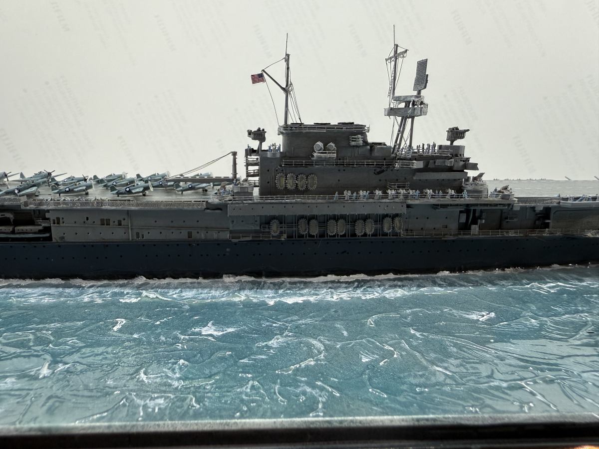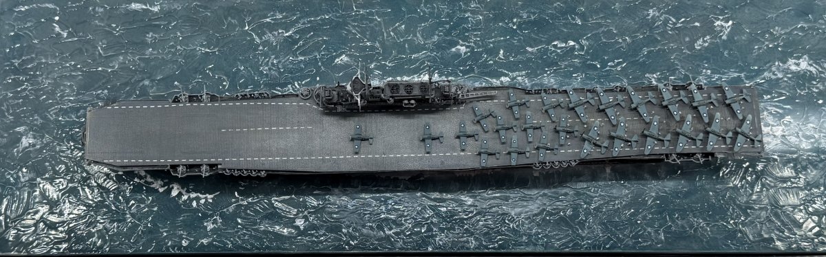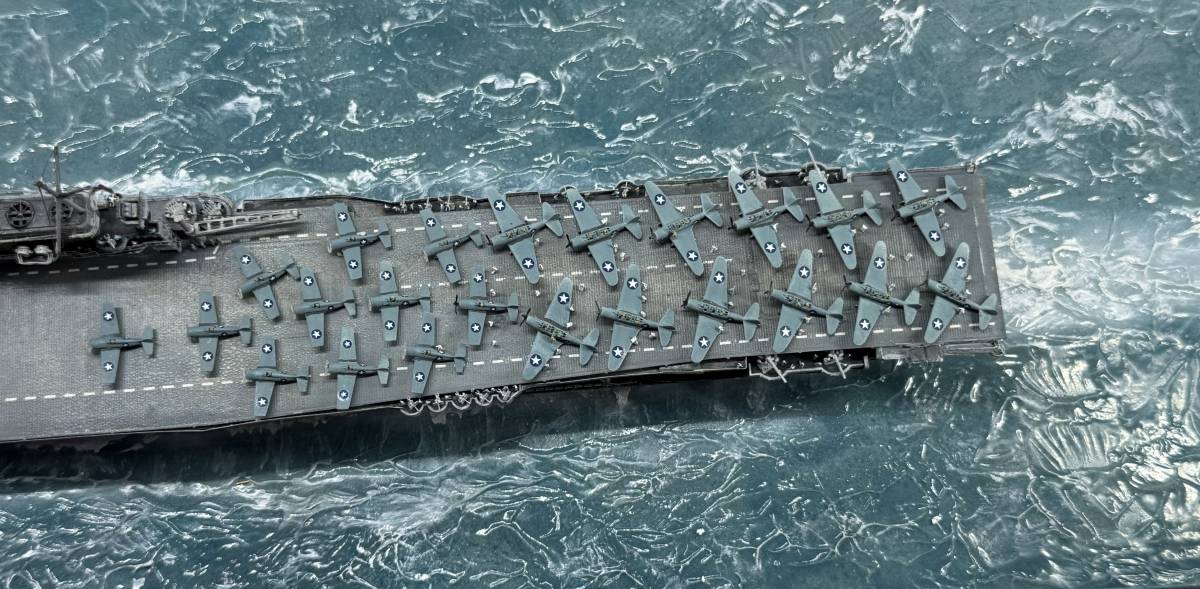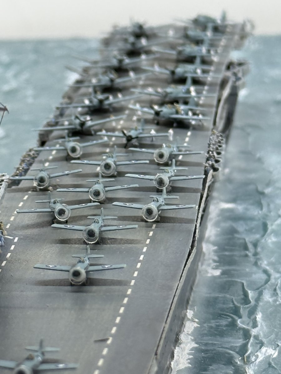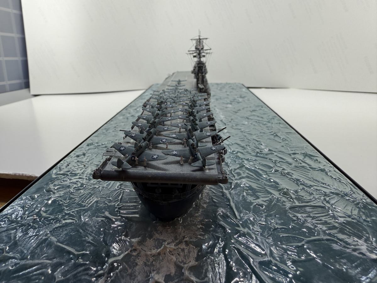 Die USS Yorktown zeigt den Zustand am 4. Juni 1942 gegen 8:50 (Hawaii Standardzeit), als eine der ersten ersten Wellen TBD Devastators und F4F-4 Wildcats zum Angriff auf die japanischen Träger starteten. Von den 12 gestarteten Torpedobomber gingen 10 Maschinen verloren, ohne Schäden auf den japanischen Trägern verursacht zu haben. Allerdings zwangen diese, sehr tief geflogenen Torpedoangriffe die japanischen Jäger in eine geringere Höhe, sodass sie die hoch anfliegenden Dauntless-Sturzkampfbomber nicht angreifen konnten. Die Versenkung aller Träger ging letztendlich auf das Konto der Dauntless und ihrer Piloten.