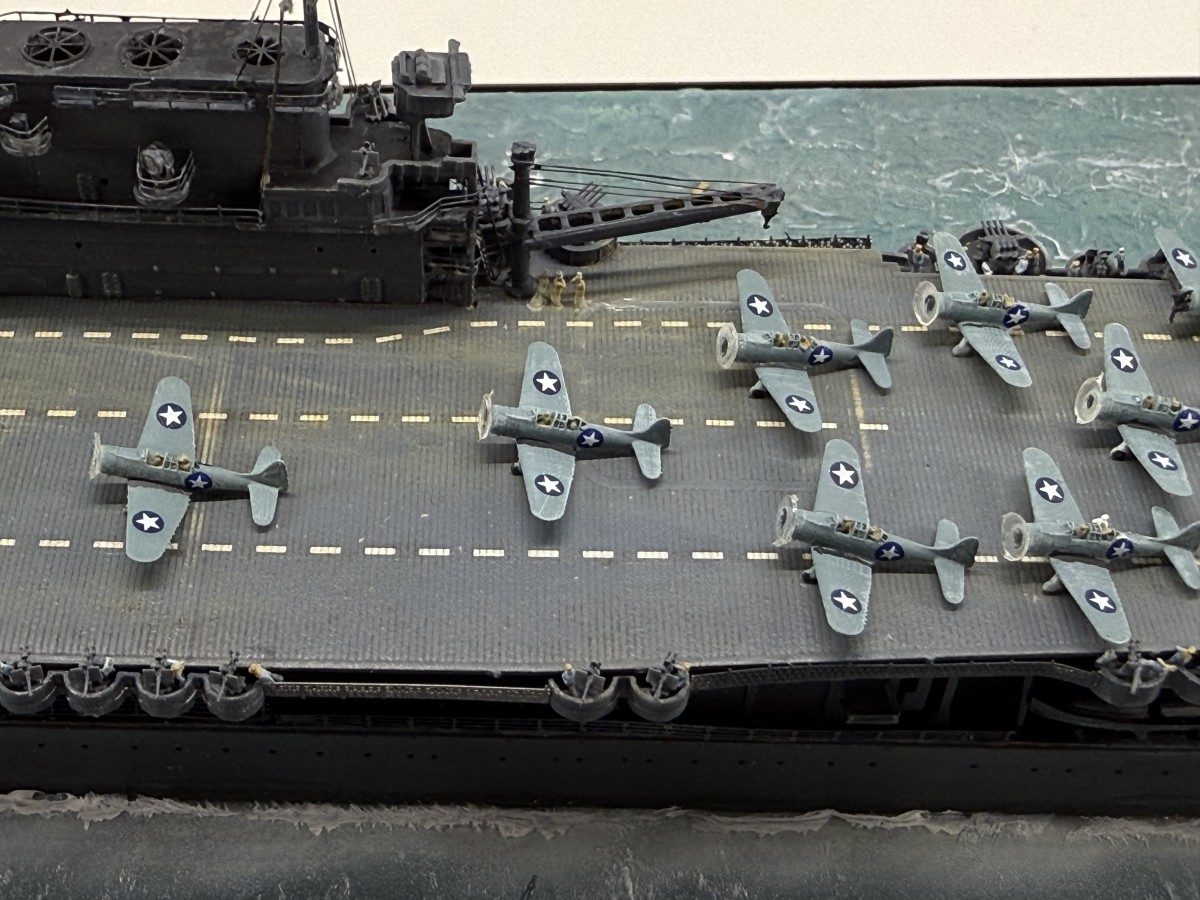 Mein Modell der USS Enterprise zeigt den Zustand gegen 17:00 (Hawaii Standardzeit) des gleichen Tages. Die USS Yorktown war zu diesem Zeitpunkt durch japanische Luftangriffe außer Gefecht gesetzt worden, sodass alle Dauntless-Maschinen auf die USS Enterprise verlegt wurden. Gemeinsam mit den verbliebenen Maschinen der USS Enterprise wurde ein letzter Angriff auf die japanische Flotte gestartet, der zur Versenkung der Hiryu führte.