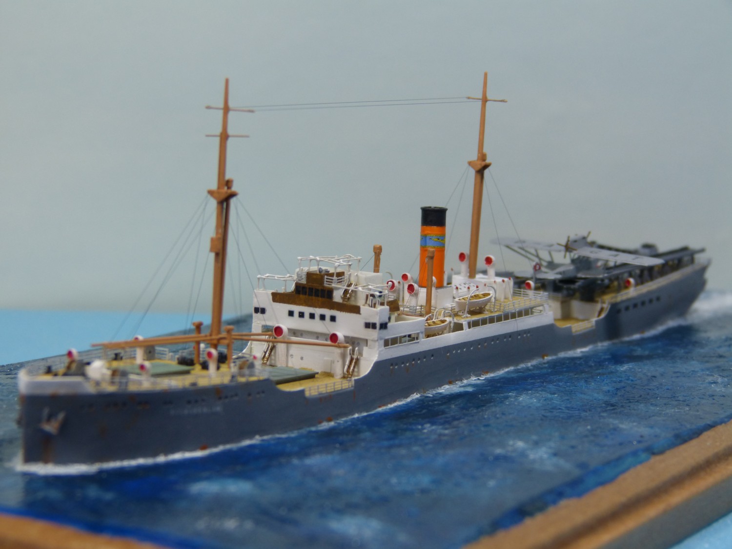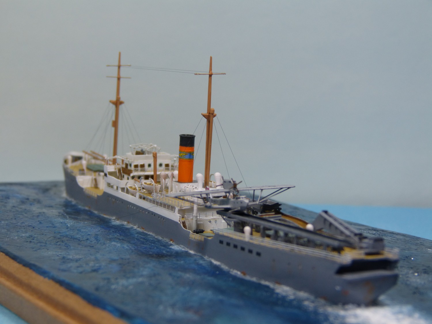 Das Modell des Katapultschiffs Schwabenland baute ich im Maßstab 1/700 mit Booten, Lüftern und Winden von Starling Models; im Übrigen ist das Modell vollständig im Eigenbau entstanden, mit vielen Dank an Lars Scharff für Zeichnungen und Informationen. Als Referenz habe ich außerdem Fotos verwendet, die ich im Internationalen Maritimen Museum Hamburg von deren ausgezeichnetem Großmodell aufgenommen habe. Die Anordnung der Flugzeugrampen am Heck scheint mehrfach verändert worden zu sein, daher hoffe ich, dass ich den Zustand für die Zeit ihres Antarktisbesuchs korrekt wiedergegeben habe. Für den mittleren Abschnitt des Krans habe ich einige Fotoätzteile aus einem japanischen Flugzeugträger-Bausatz von Gold Medal Models verwendet; die Seiten sowie der übrige Teil des Krans entstanden jedoch im Eigenbau aus Polystyrolplatten. Mit dem Traggerüst der Sonnensegel auf der Brücke bin ich nicht ganz zufrieden – Fotoätzteile wären hier eine deutlich sauberere Lösung gewesen, aber ich konnte nichts Passendes finden, und eine Sonderanfertigung hätte sich nicht gelohnt. Daher habe ich 0,2-mm-Draht verwendet. Das Gestänge schien ein recht markantes Detail zu sein, weshalb ich mich entschied, es darzustellen.