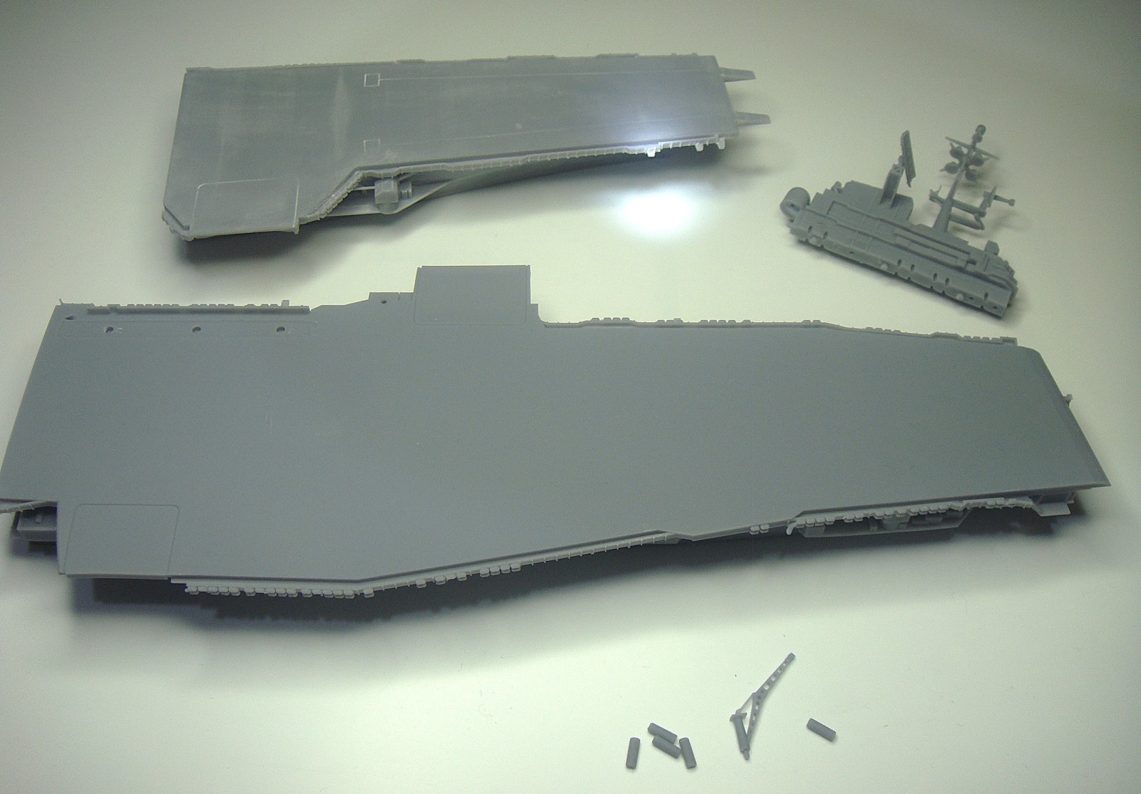 Eine der ersten Arbeiten vor Baubeginn bestand darin, die rund um alle Laufgänge (Catwalks) mitgedruckten Rettungsfloß-Behälter zu entfernen. In der Realität waren diese auf dem Schiff nie installiert. Sie wurden daher durch ältere, aus der Nachkriegszeit stammende Rettungsmittel von Tom's Modelworks ersetzt.