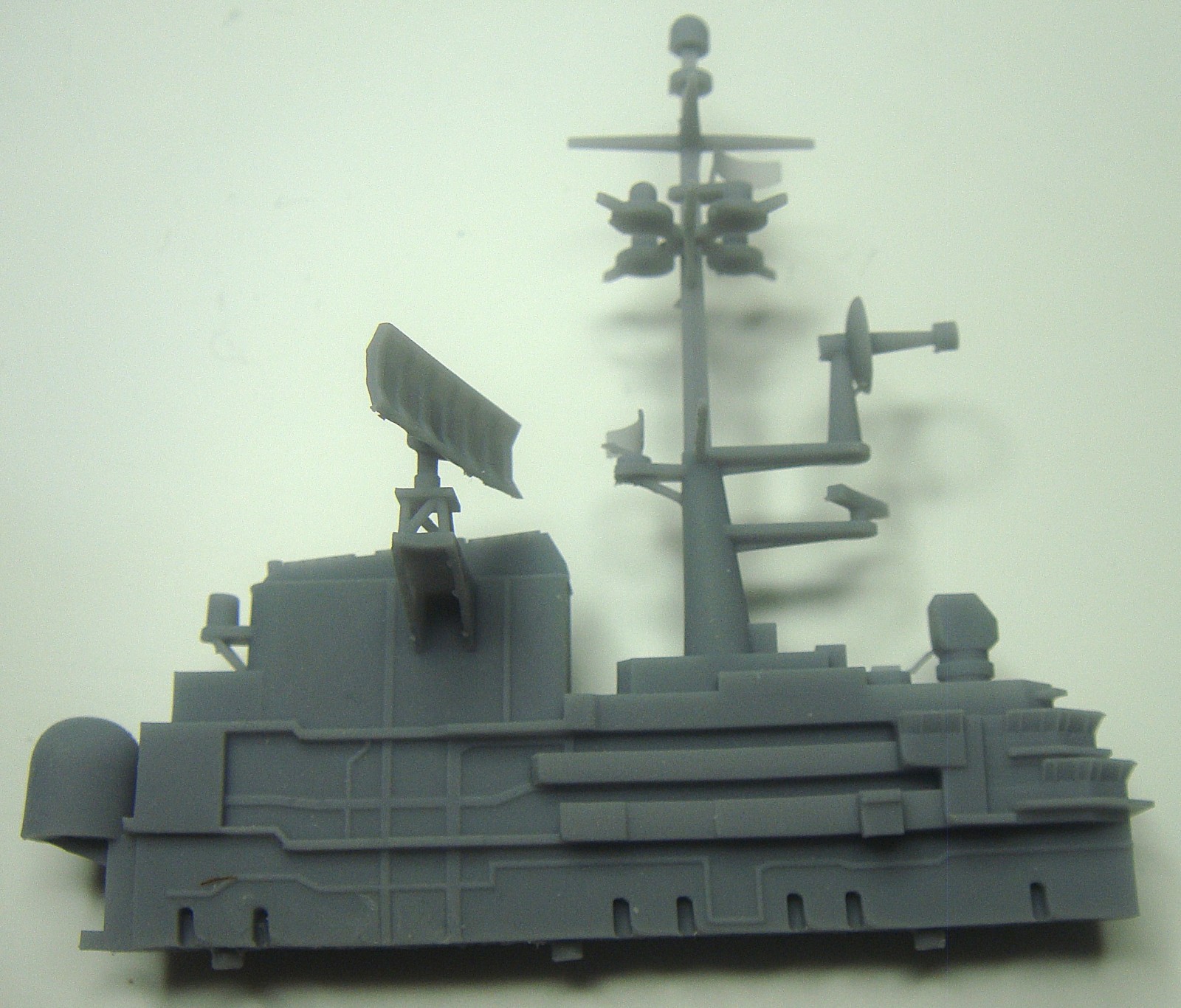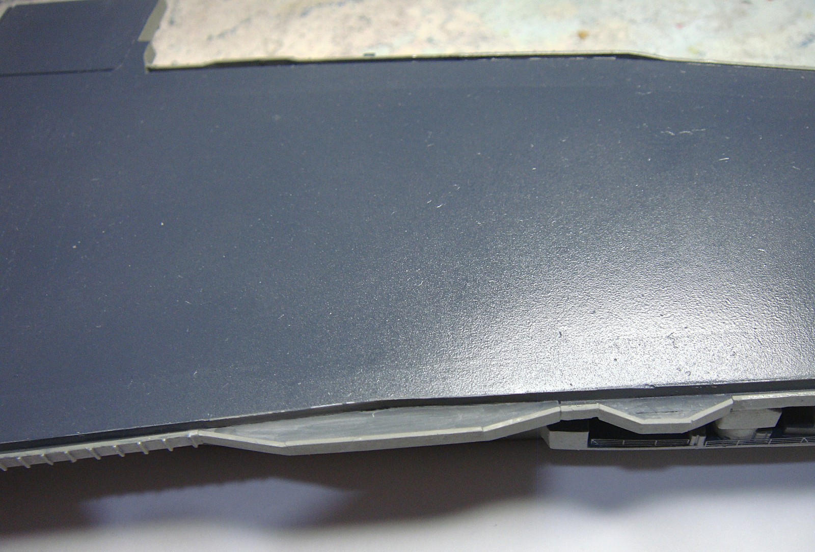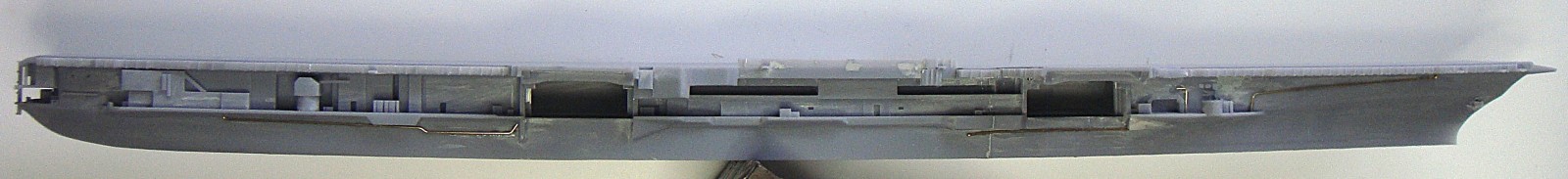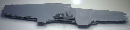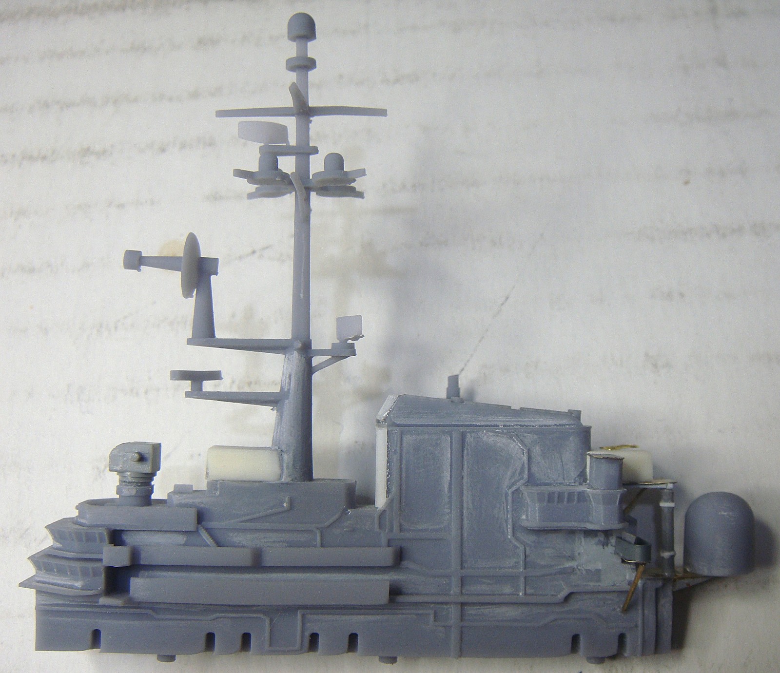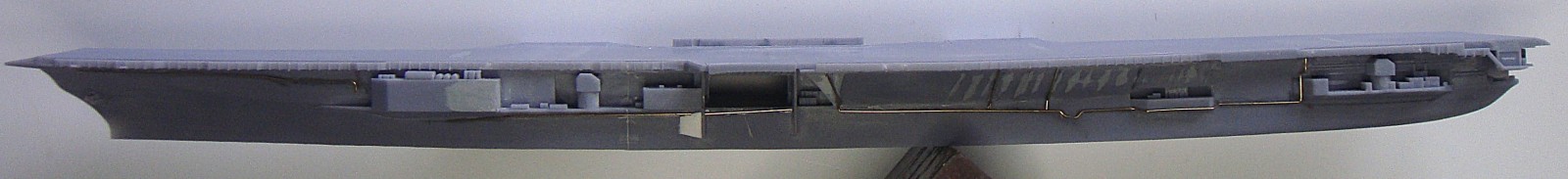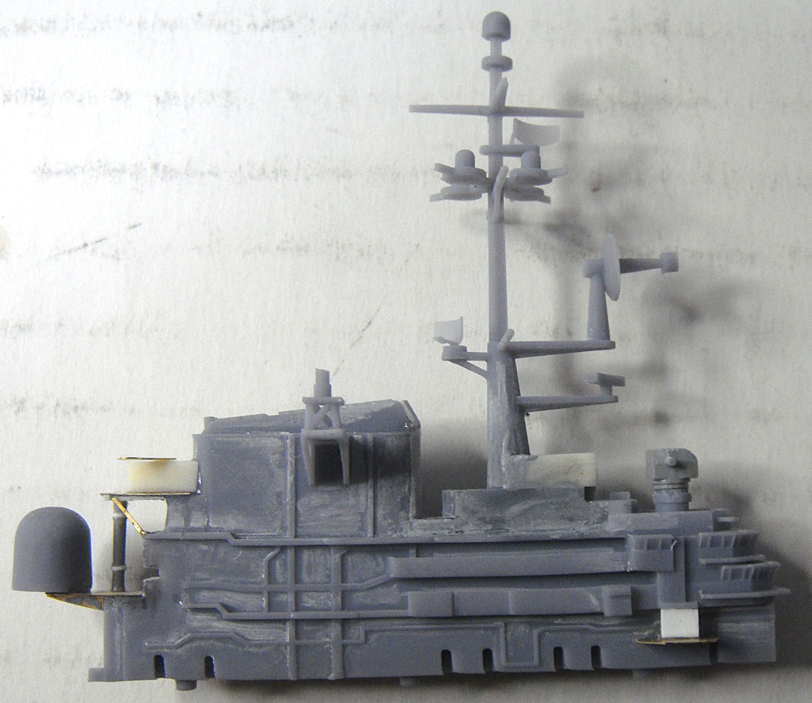 Einige Bereiche der Insel sowie verschiedene Partien am Rumpf mussten überarbeitet werden, um Details zu ergänzen, die an den Bausatzteilen fehlten. Ein gutes Beispiel ist der verlängerte Laufgang an der achteren Backbordseite des Flugdecks. Dieser war am Heck als massives Bauteil mitgedruckt und musste vorsichtig entfernt werden, um anschließend durch einen neu angefertigten Laufgang ersetzt zu werden – etwas, das mir leider erst auffiel, nachdem die Rumpfteile bereits zusammengefügt, lackiert und mit Abziehbildern versehen waren.
