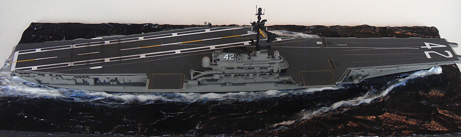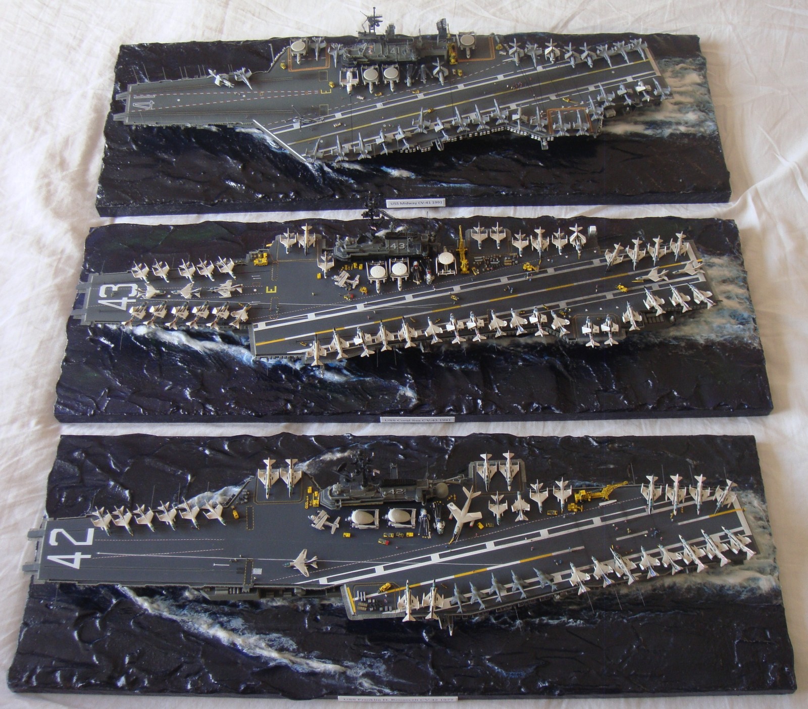 sowie alle drei Träger der Midway-Klasse gemeinsam in ihren jeweiligen Endkonfigurationen. Die USS Midway stammt aus dem OrangeHobby-Bausatz, Coral Sea aus dem LinersWorld-Bausatz. Es ist interessant zu sehen, wie unterschiedlich sich ihre Ausrüstungs- und Aufbauvarianten bis zum Ende ihrer Dienstzeit entwickelt haben.