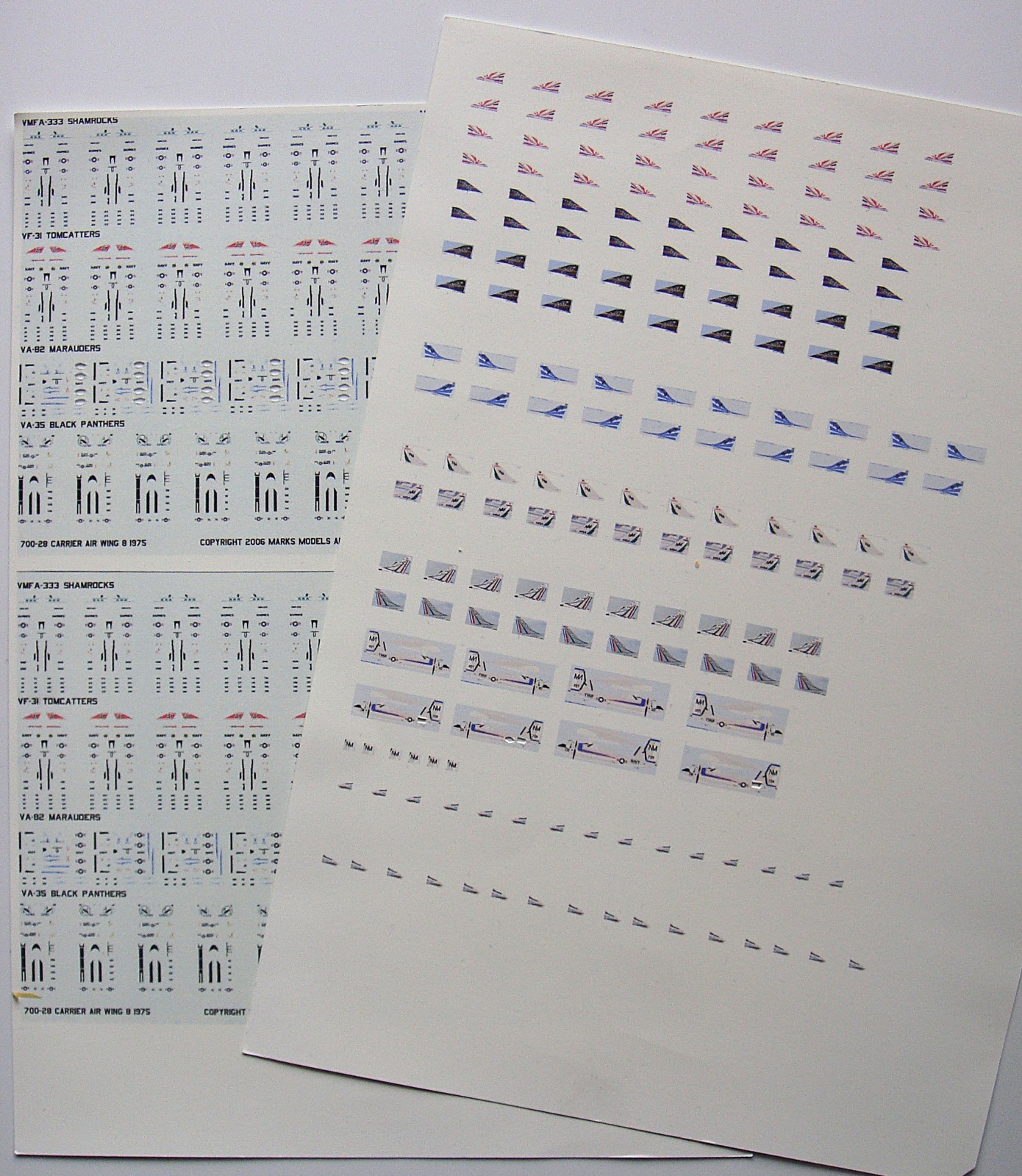 Die Abziehbilder für das Schiff stammen aus einem Starfighter-Decals-Satz für Flugzeugträger der Essex-Klasse aus der Nachkriegszeit. Die Markierungen der Flugzeuge sind eine Mischung aus generischen Decals aus einem Starfighter-Bausatz sowie von mir selbst gedruckten Abziehbildern für Staffel­farben und Beschriftungen bzw. Nummerierungen.