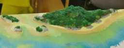 Nachdem die Landschaft sowie Häuser, Wege und die Hafenanlagen fertiggestellt waren, ging ich an die Meeresgestaltung. Zunächst studierte ich noch mal intensiv, wie in tropischen Gewässern an schönen Tagen die Farbe des Wassers an tiefen Stellen, in Küsten-/Strandnähe und zwischen Inseln und Felsen ist. Weiterhin betrachtete ich Bilder, auf denen unter Wasser Seegrasfelder und Korallen dunkle Flecken bildeten.