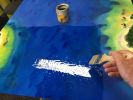 Mit ein paar ausgedruckten Vorlagen begann ich zunächst die Flachwasserzonen zwischen Inseln und die Strand- und Uferstreifen, an denen die Färbung vom Sandgelb über ein helles Türkisgrün bis zu einem kräftigen Blau verlief, zu gestalten. Mit Aquarell- und Wasserfarben malte ich zunächst die Grundfarbe und die fließenden Übergänge direkt auf die Holzplatte.