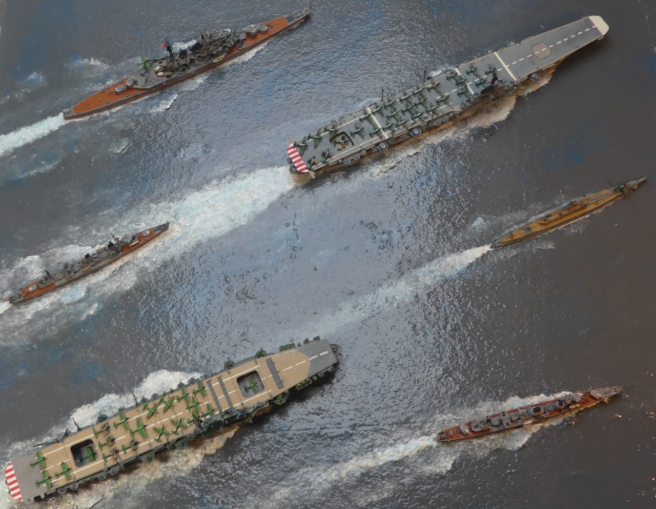 Als ich also überlegte, ob ich die Modelle verkaufen sollte, kam mir die Idee, sie zu bauen und als eine „what if“-Trägerkampfgruppe, versetzt ins Frühjahr/Sommer 1945, in einem kleinen Diorama zu präsentieren.