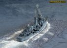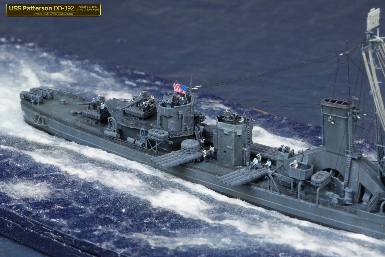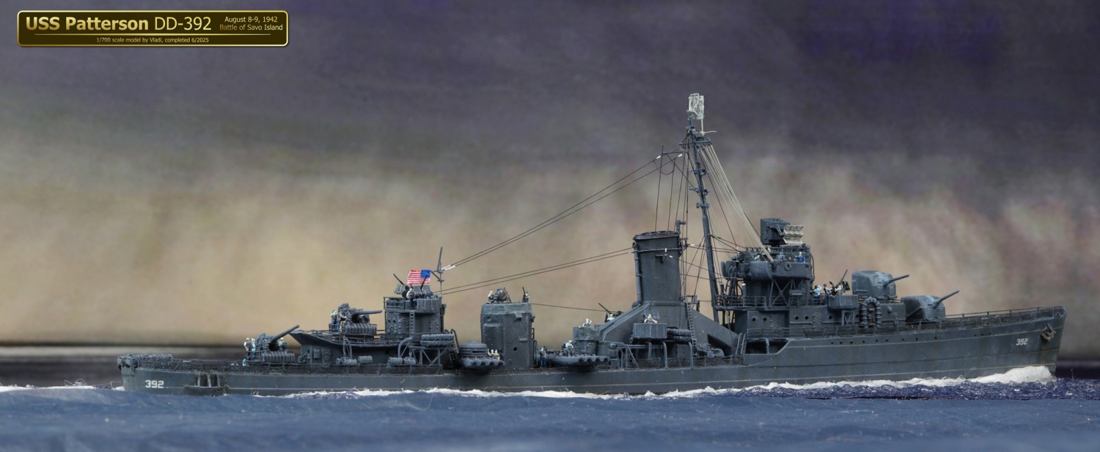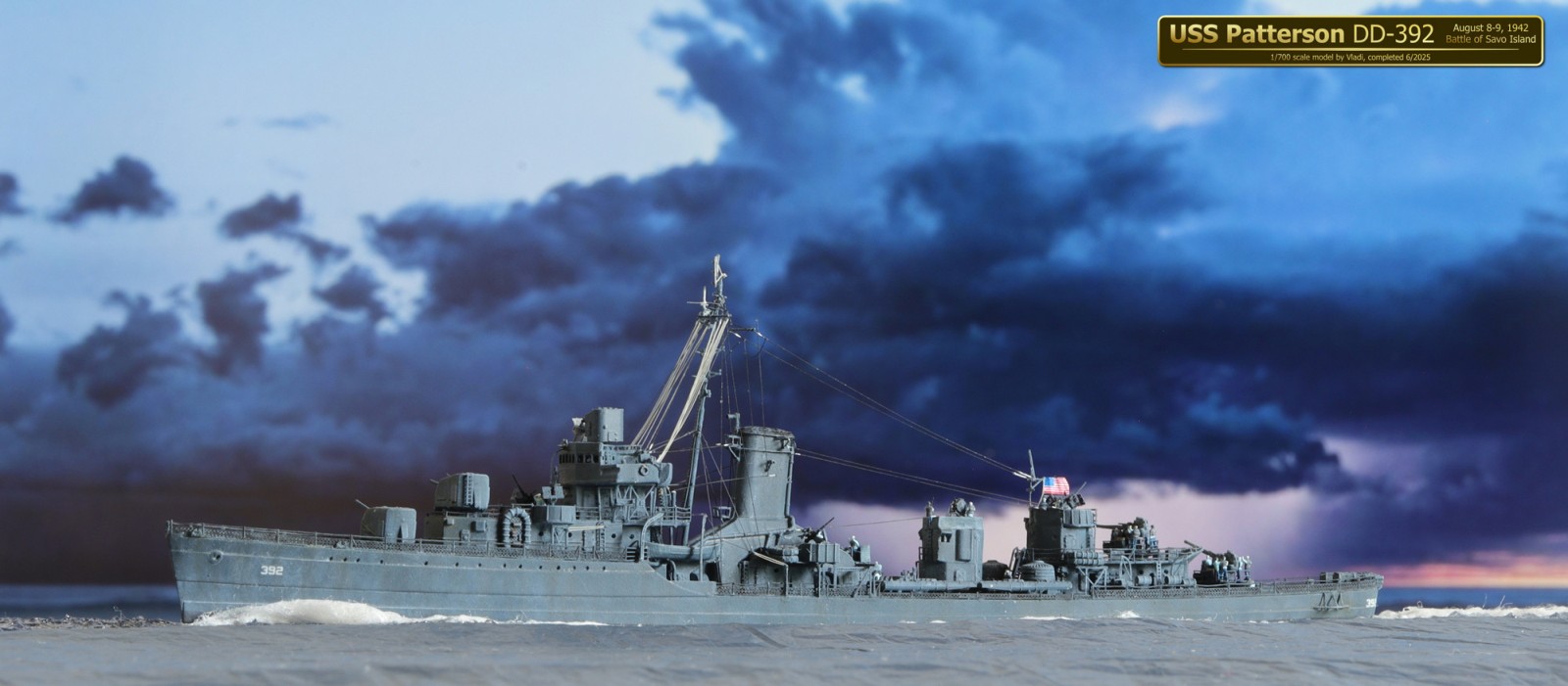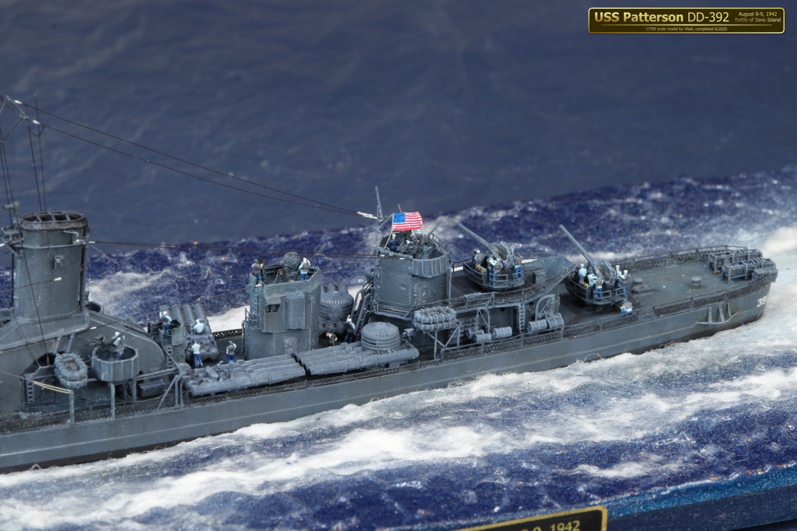 Mein Modell zeigt die Patterson zu Beginn der Schlacht von Savo Island nach einer scharfen Wende nach Backbord, die ihre Geschütze und Torpedos auf den Feind richtet, um das Feuer zu eröffnen.