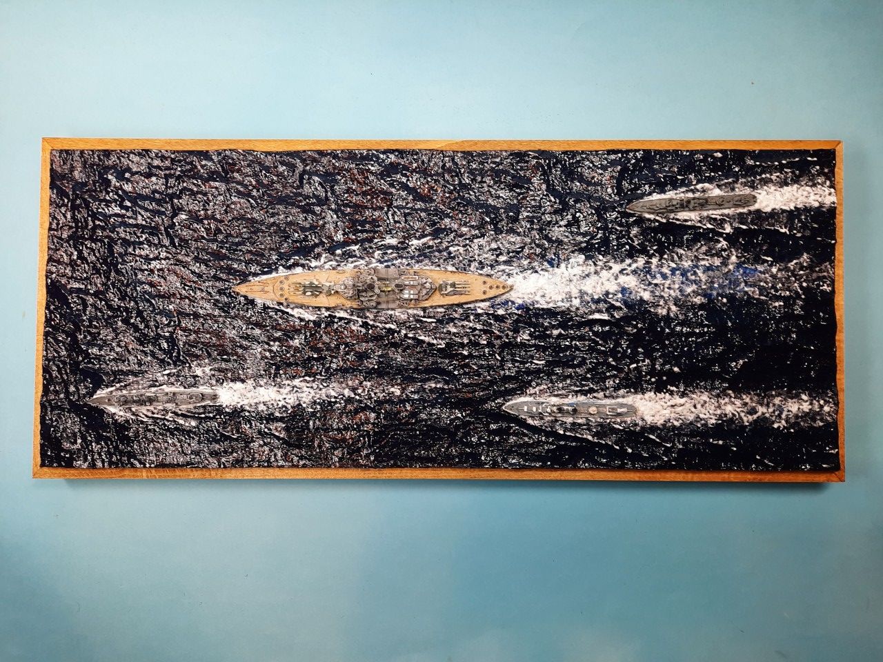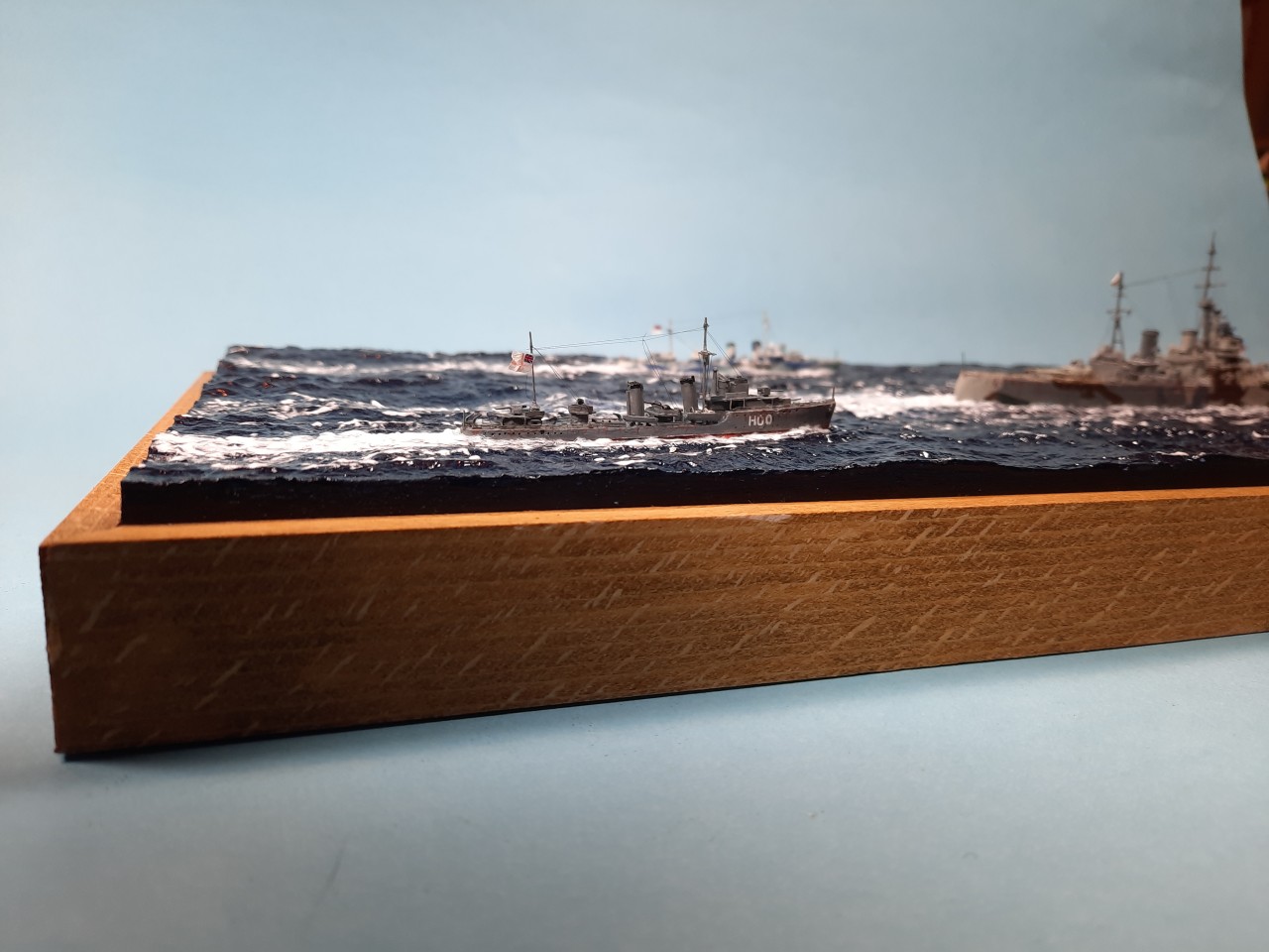 Wichtig war es gut zu überlegen wie hoch die Wellenstrukturen sein können. Denn im Maßstab 1/1200 ist der Millimeter schon 1,20 m hoch, fünf Millimeter geben über fünf Meter hohe Wellen… Also aufgepasst, dass die Topographie der Meeresoberfläche nicht allzu turbulent wird. Bevor jedoch die Wellen geformt werden, habe ich die Positionen der Schiffe festgelegt, markiert und großzügig ausgeschnitten. Vorsichtig also mit scharfer Klinge zuerst die „atlantische Dünung“ und ein paar größere Wellen eingeschnitzt, die kleineren dann mit verschiedenen Kugelfräsern mit 5000 Touren eingeschliffen und zum Schluss ganz feine Ribbelwellen mit zerlegten Taschentuch und wasserverdünntem Holzleim aufgebracht.