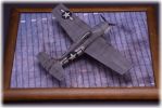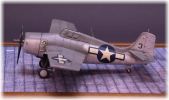 Das Modell der FM-1 Wildcat ist aus dem Bausatz von Hasegawa im Maßstab 1/72, der schon etwas älter ist, aus der Box gebaut. Lediglich dehnbares Garn als Antennendraht kam hinzu. Die Farben stammen von Mr. Hobby (Gunze), Tamiya und Revell. Die Alterung erfolgte nach altbewährtem Rezept: Washing mit verdünnter Ölfarbe und Einsatz von verschiedenen Pastellkreiden (Abgasfahnen, Kordithspuren an den Bordwaffen). Die Endversiegelung erfolgte mit mattem Klarlack von Revell.