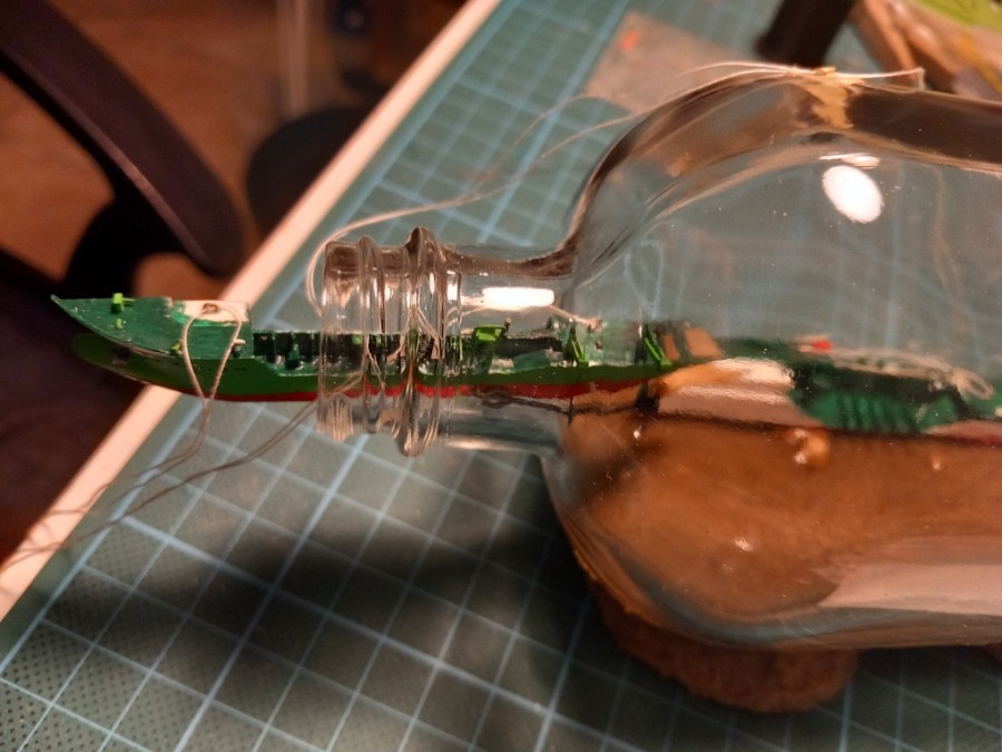 Aufgrund der Schichtung des Epoxidharzes und der Lichtbrechung an der gewölbten Flasche ist das Ergebnis nicht ganz so geworden, wie ich es mir vorgestellt hatte.