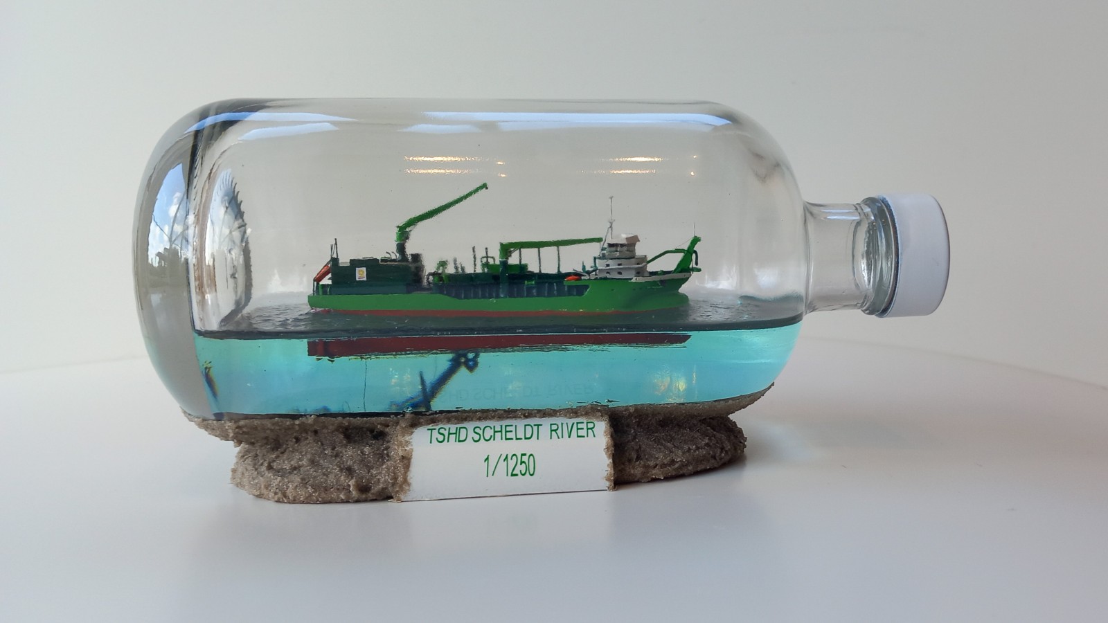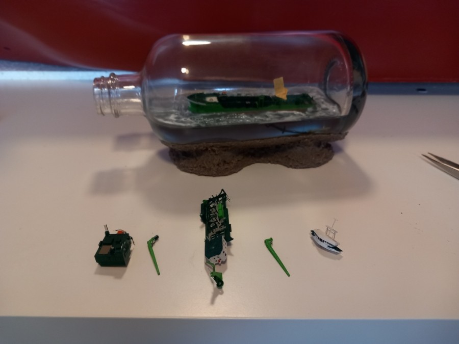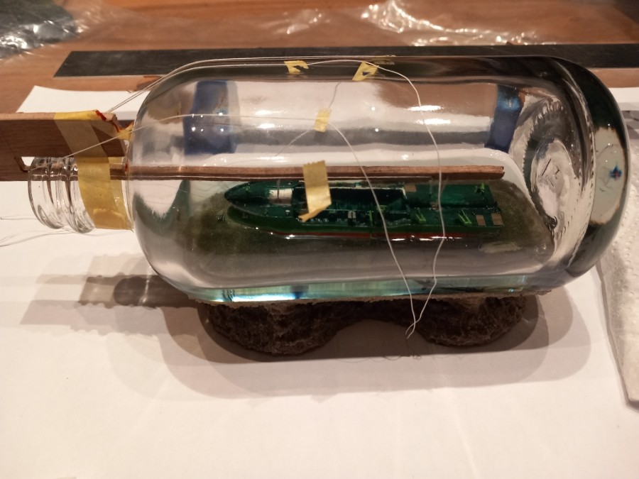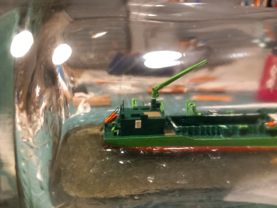 Der Bau als Flaschenschiff ist viel komplexer, als man erwarten würde, denn der Rumpf ist breiter als der Flaschenhals, vor allem mit dem herausragenden Baggerrohr. Außerdem schwimmt Styrol nicht in Epoxidharz. Also habe ich zunächst die beiden Rumpfhälften mit Seilen an kleinen Halterungen befestigt. Dann habe ich die Hälften miteinander verbunden und den Rumpf in die richtige Position gehängt. Anschließend habe ich das Epoxidharz eingegossen. Dann bin ich von achtern nach vorn gegangen, wobei die hintere Aufbauten die hinteren Seilhalterungen und die vorderen Aufbauten die vorderen verdeckten.