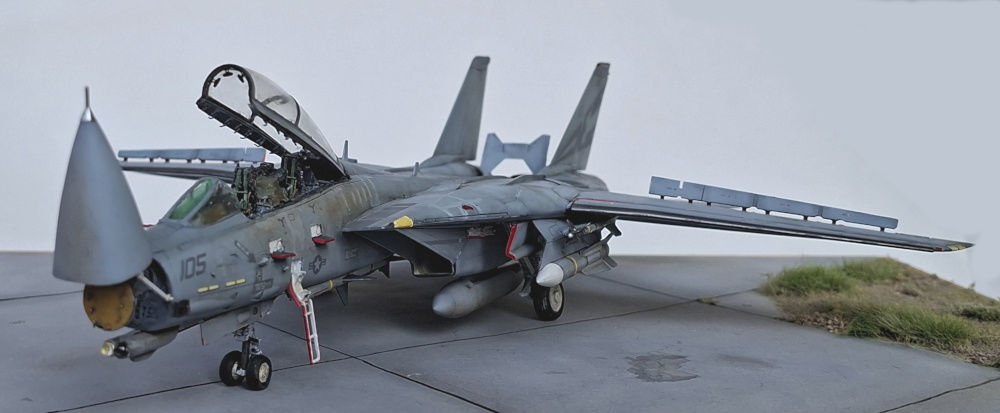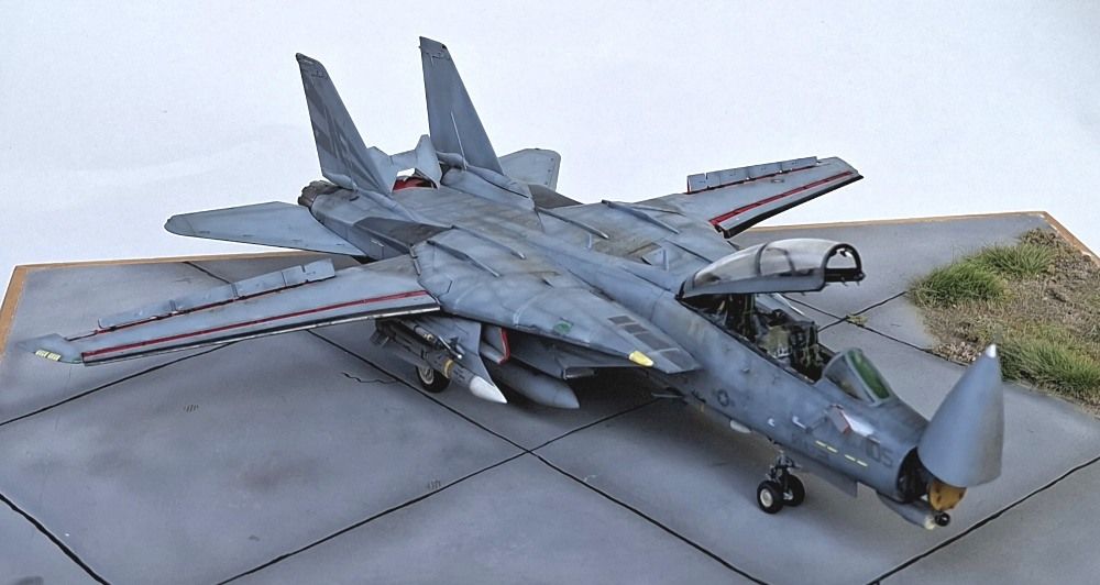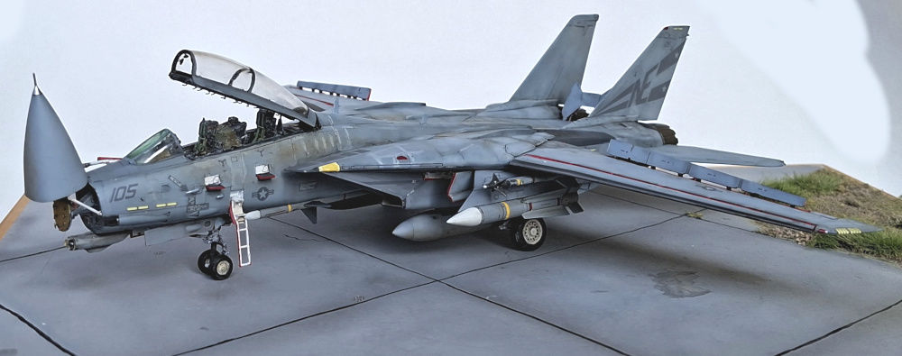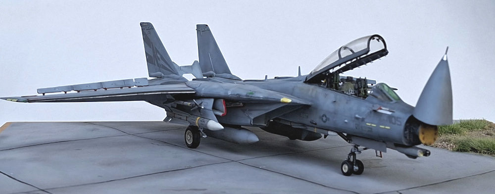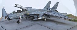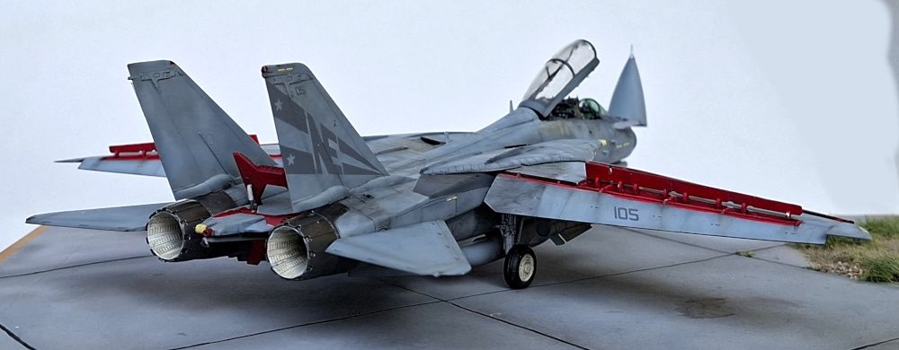 Das Modell der F-14D Tomcat wurde aus dem Bausatz von Great Wall Hobby gebaut. Der Bausatz an sich mag nicht billig sein aber aus meiner Sicht ist er sein Geld wert. Er ist sehr detailliert, sehr passgenau und es gibt viele Optionen. Es wurde ein Aires-Cockpit inklusive Sitzen verbaut, alles weitere ist direkt aus dem Kasten gebaut bzw. das Radar wurde mit etwas Plastikfaden verfeinert. Das Aires-Cockpit habe ich verbaut, weil ich es da hatte - eigentlich hätte ein Eduard-Set genügt, ok Sitze gehen immer.